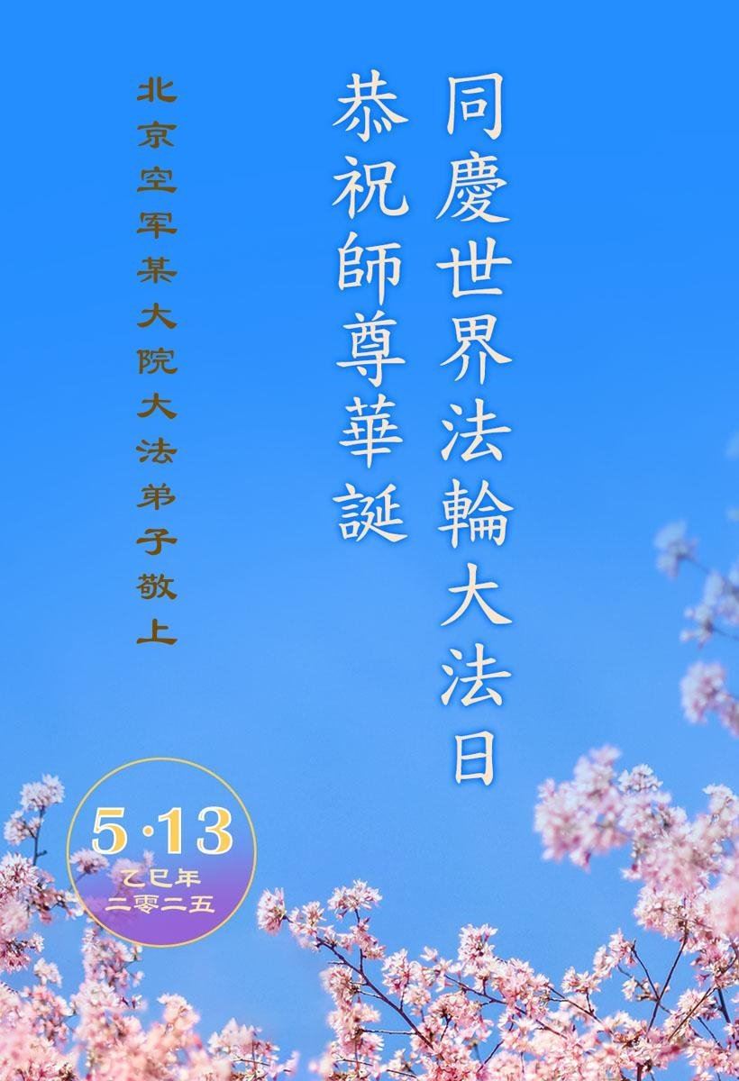 Praktikanti iz zračne baze u Pekingu su napisali: „Na dan kada svi slave Falun Dafa, iskreno želimo Učitelju sretan rođendan. Uprkos progonu od strane Komunističke partije Kine, čvrsto vjerujemo u Učitelja i Fa i dobro ćemo činiti tri stvari kako bismo spasili više ljudi. Učitelju, uvjeravamo vas u to.“