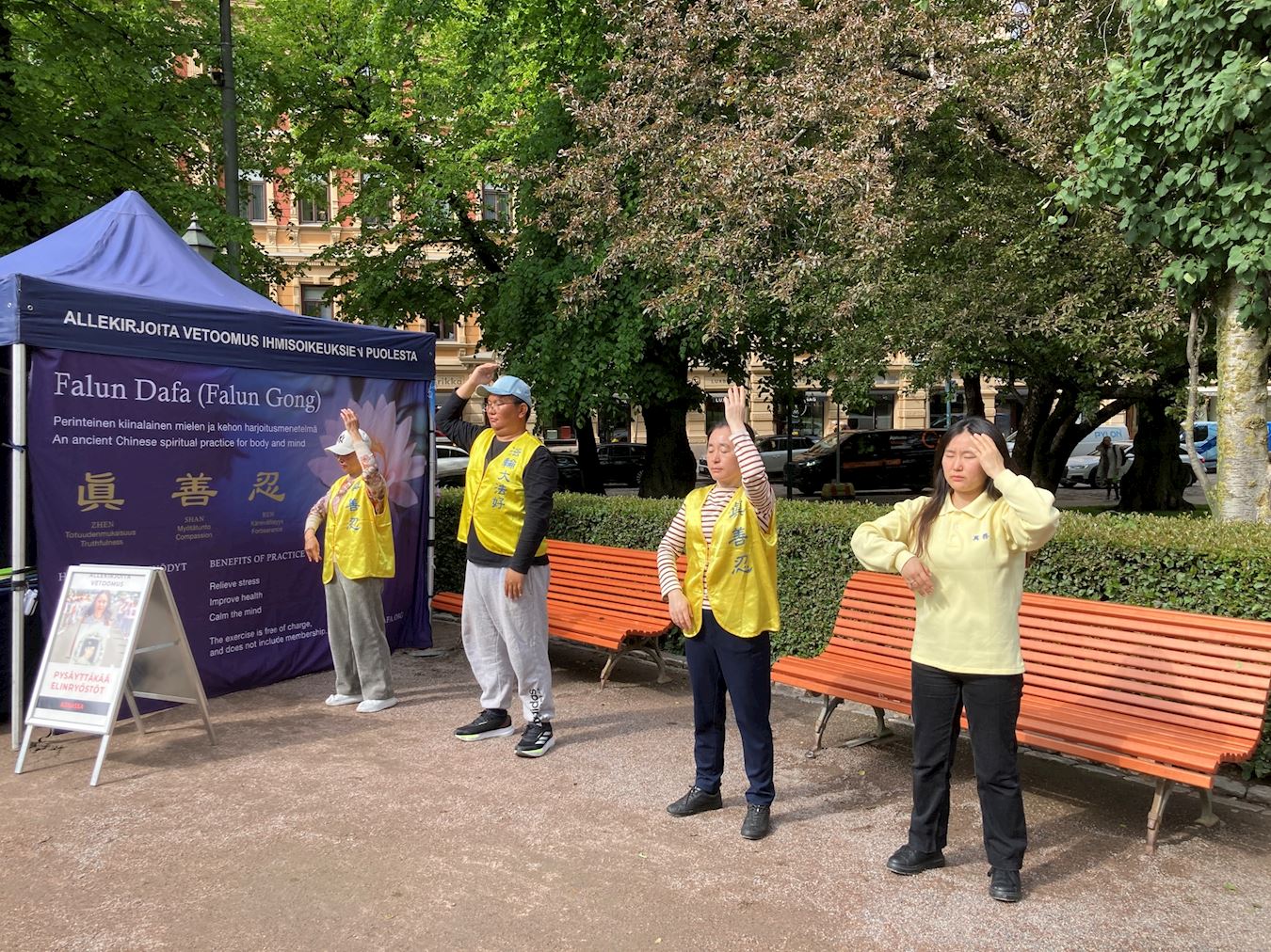 Praktikanti Falun Dafe pridružili su se proslavi u parku Esplanadin Puisto u centru Helsinkija, popularnoj lokaciji, 12. juna 2025. Demonstrirali su vežbe, delili letke i govorili ljudima o dobrobitima praktikovanja Falun Dafe (poznate i kao Falun Gong).