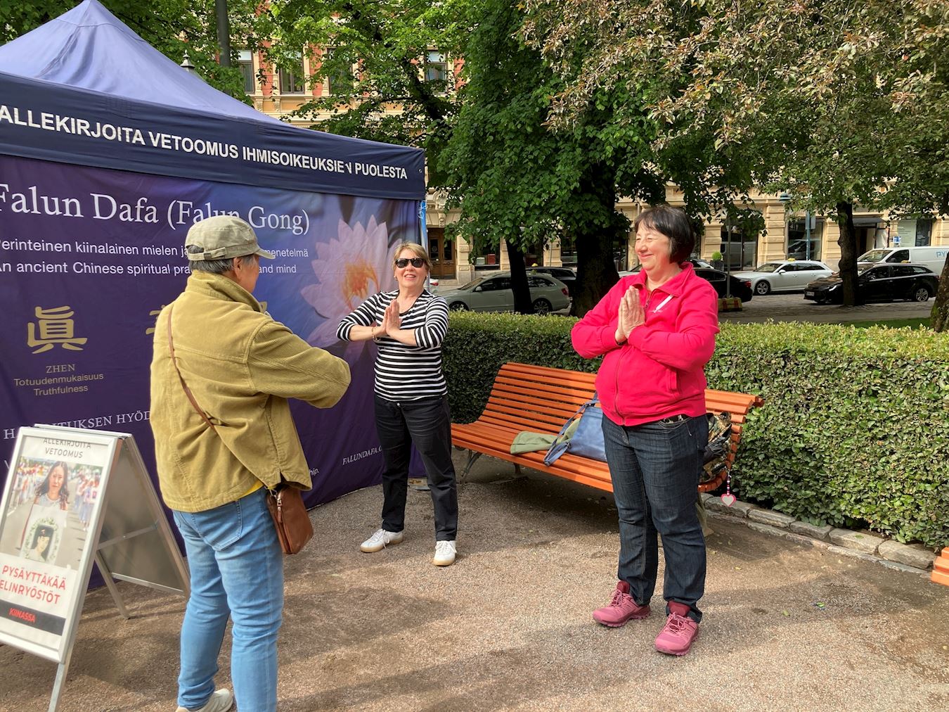 Jedna penzionerka iz Finske rekla je praktikantima: „Znam za vašu praksu, koja naglašava poboljšanje u razmišljanju. Ovo nije religija, ali vas KPK progoni u Kini. To mi je neverovatno.“ Jedan praktikant je objasnio da Falun Dafa naglašava Istinitost-Blagost-Trpeljivost. Žena je rekla: „Kina je totalitarna zemlja, ali sloboda se ne bi smela uskraćivati. Verujem da svako ima pravo da izabere svoj put.“ Izrazila je zahvalnost na prilici da sazna više.