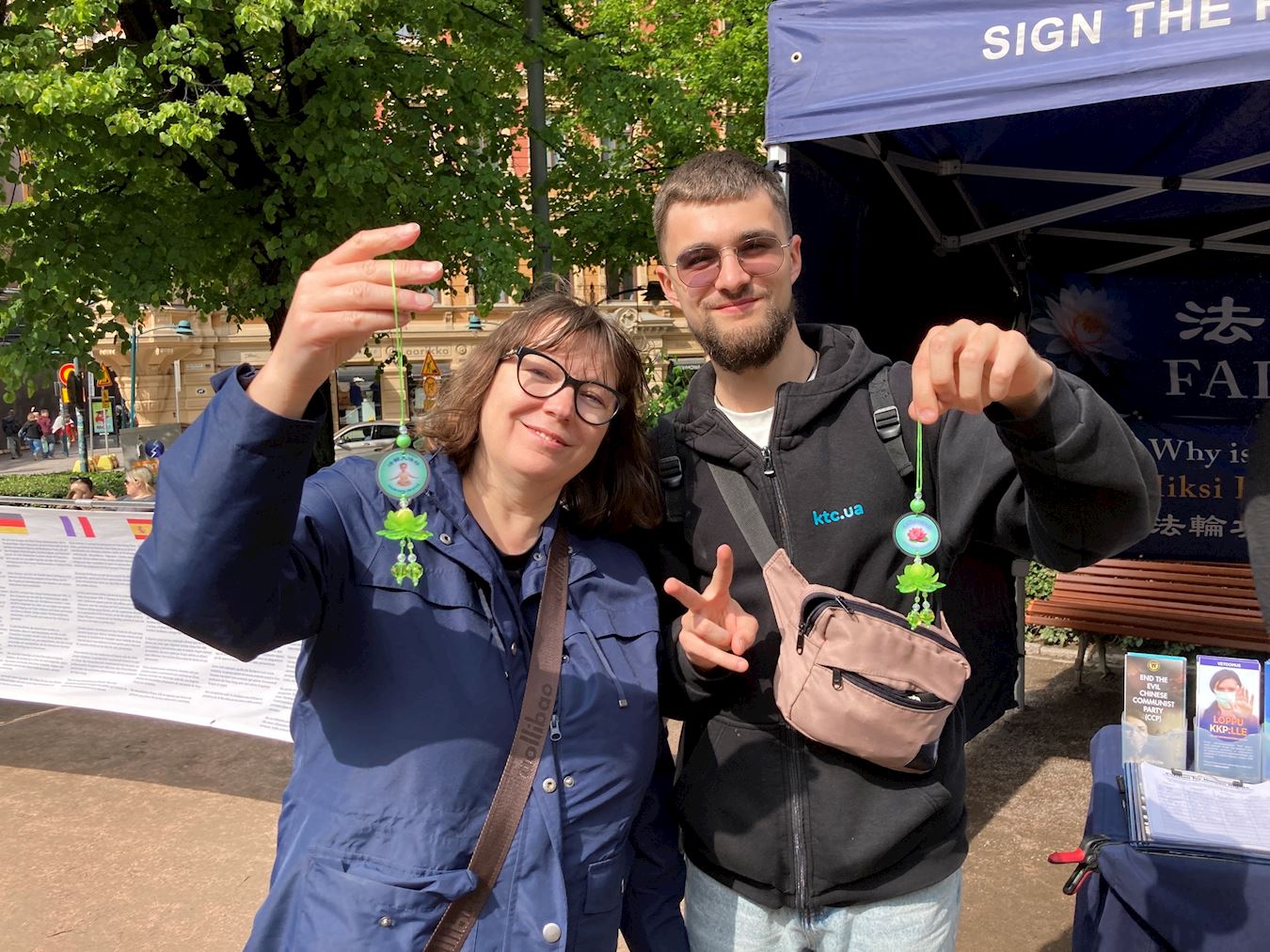 Penzionisani finski par iz Kuopija bio je na odmoru u Helsinkiju. Rekli su da su gledali Yle (Finska radiodifuzna kompanija) i čuli da su praktikanti Falun Dafe u Finskoj bili uznemiravani. Čovek je rekao praktikantima: „Nadam se da ste bezbedni.“