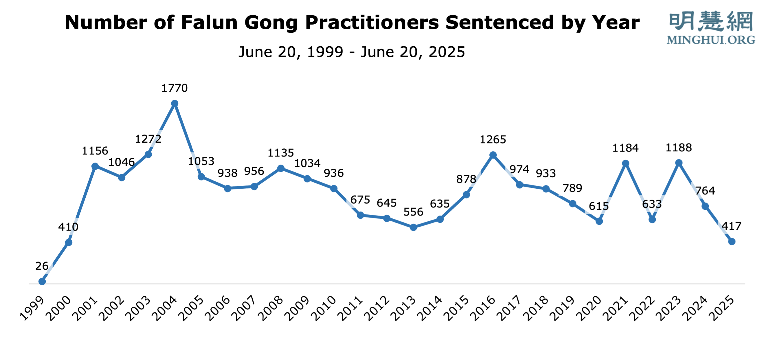 Ovaj članak pruža grupu statističkih podataka o progonu Falun Dafa koje je prikupio Minghui.org između 20. lipnja 1999. i 20. lipnja 2025. Ove brojke omogućuju uvid u cjelokupnu situaciju progona, sposobnost i naporan rad praktikanata u Kini u prikupljanju i prenošenju informacija, kao i rezultate neumornog truda svih praktikanata u suzbijanju progona tijekom proteklih 26 godina. Iz slika 3, 5, 7 i 9 vidimo trend koji ukazuje na to da se progon bliži kraju.