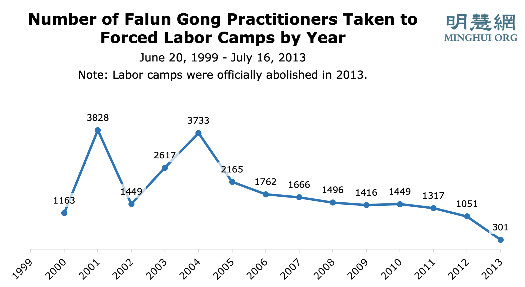Minghui je počeo objavljivati statistička izvješća 2015. Nažalost, nedostaju podaci između listopada i prosinca 2015., kao i između listopada i prosinca 2016. Za te dvije godine koristili smo podatke iz gore spomenutog 25-godišnjeg izvješća.