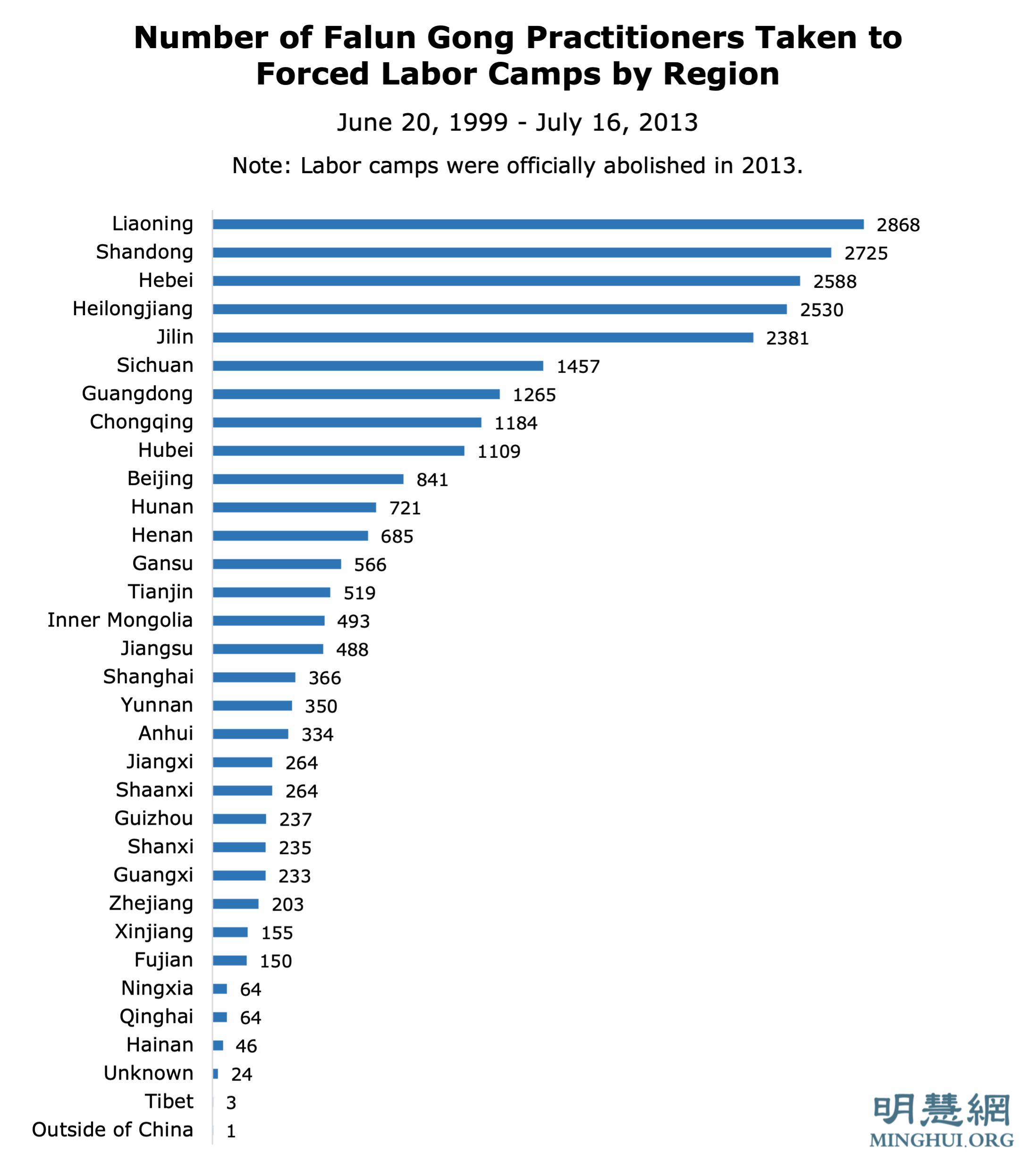 Napomena: Postoje odstupanja između raščlanjivanja po godinama i po regijama. Podaci iz 2016. i ranije preuzeti su iz Minghui Report: The CPC's Persecution of Falun Gong: 25 Years and Counting (Izvještaj Minghui-a: Progon Falun Gonga od strane KPK: 25 godina s brojevima), dok su kasniji podaci dobiveni iz statistike objavljene na Minghui.org.
