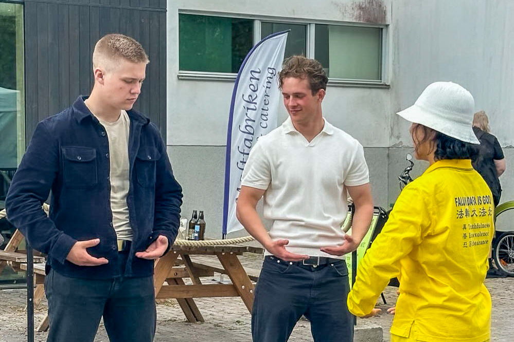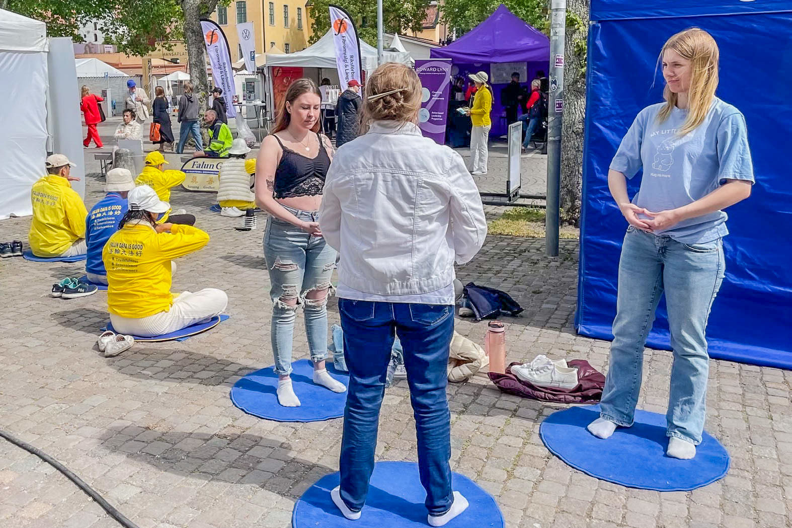Dve mlade Šveđanke su rekle da su prošle godine čule za Falun Gong. Ove godine su saznale više o Falun Gongu i zatražile da nauče vežbe. Nakon što su ih uradile, rekle su da su videle svetla mnogih boja. Kada su radile drugu vežbu, obe su rekle da su osetile da su njihova tela okružena moćnom energijom. Rekle su da se takva divota ne može opisati rečima. Bile su veoma emotivne i izrazile su svoju zahvalnost. Pre nego što su otišle, takođe su dobile primerak knjige Falun Gong i rekle da će je pažljivo pročitati.