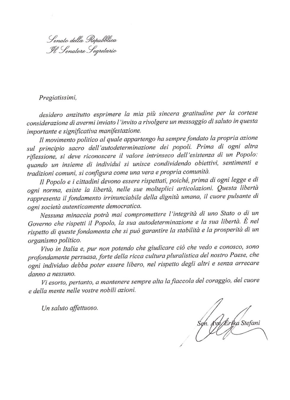 U pismu senatorice Erice Stefani stoji: „Prije svega, željela bih izraziti svoju iskrenu zahvalnost na vašoj ljubaznoj pažnji što ste mi poslali poziv da se obratim na ovom važnom i značajnom događaju.