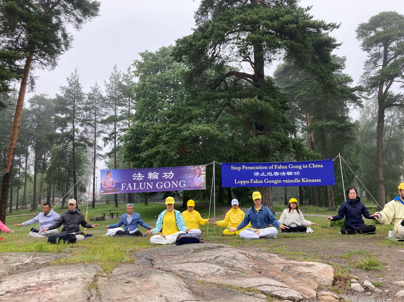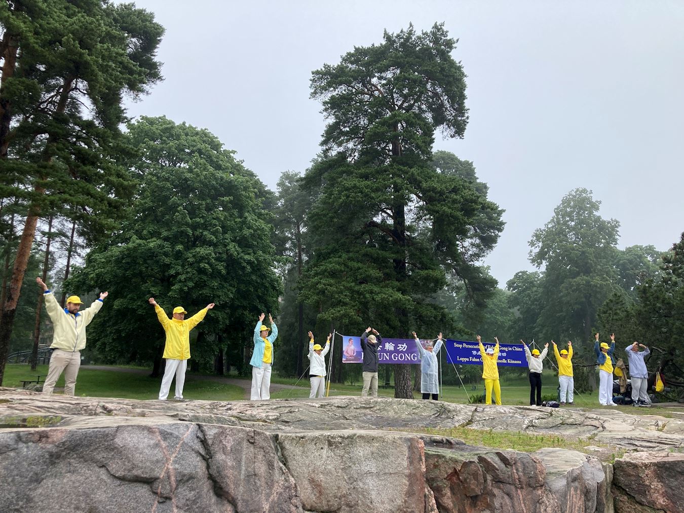 Finski praktikanti su demonstrirali Falun Dafa vježbe i dijelili informativne letke na dan 6. srpnja 2025. u parku Sibelius, poznatoj turističkoj atrakciji na zapadnoj obali Helsinkija. Njihovo grupno vježbanje ispred velikih transparenata privuklo je brojne turiste koji su saznali o progonu Falun Dafa u Kini i potpisali peticiju kojom se poziva na njegov završetak.