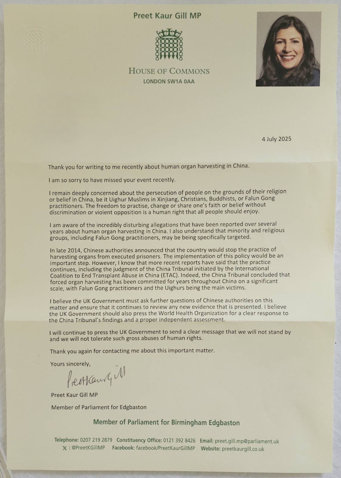 Prit Kaur Gil je napisala: „I dalje sam duboko zabrinuta zbog progona ljudi na osnovu njihove vere ili uverenja u Kini, bilo da se radi o Ujgurskim muslimanima u Sinđangu, hrišćanima, budistima ili praktikantima Falun Gonga. Sloboda praktikovanja, promene ili deljenja svoje vere ili uverenja bez diskriminacije ili nasilnog protivljenja je ljudsko pravo koje bi svi ljudi trebalo da uživaju.