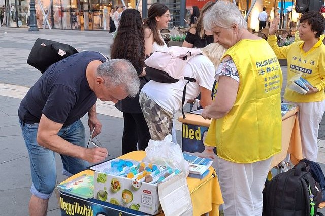Zoltán iz Érda zaustavio se kako bi saznao više o praksi. Rekao je praktikantima: „Imate stvarno dobrodušnu i ugodnu auru. Samo tako nastavite!“ Zoltán je također bio zgrožen saznavši kako je država odobrila i organizirala zločin vađenja organa. Potpisao je peticiju za osudu progona.