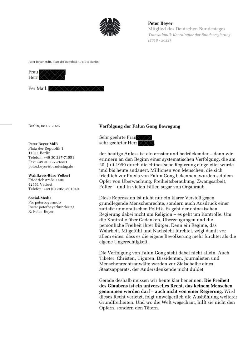 Savezna poslanica Ane Kenig je u svom pismu navela: „Uznemirujući je paradoks da se autoritarne države pozivaju na svoj poredak – dok uništavaju upravo ono što je u osnovi svakog legitimnog poretka: slobodu savesti. 20. jula 1999. Narodna Republika Kina je počela da proglašava Falun Gong pretnjom po državu, ne zbog nasilja, već zbog njegove unutrašnje nezavisnosti. Od tada smo svedoci državno organizovanog progona miliona građana, ne uprkos, već zbog njihove vere.“