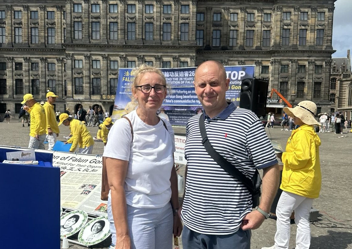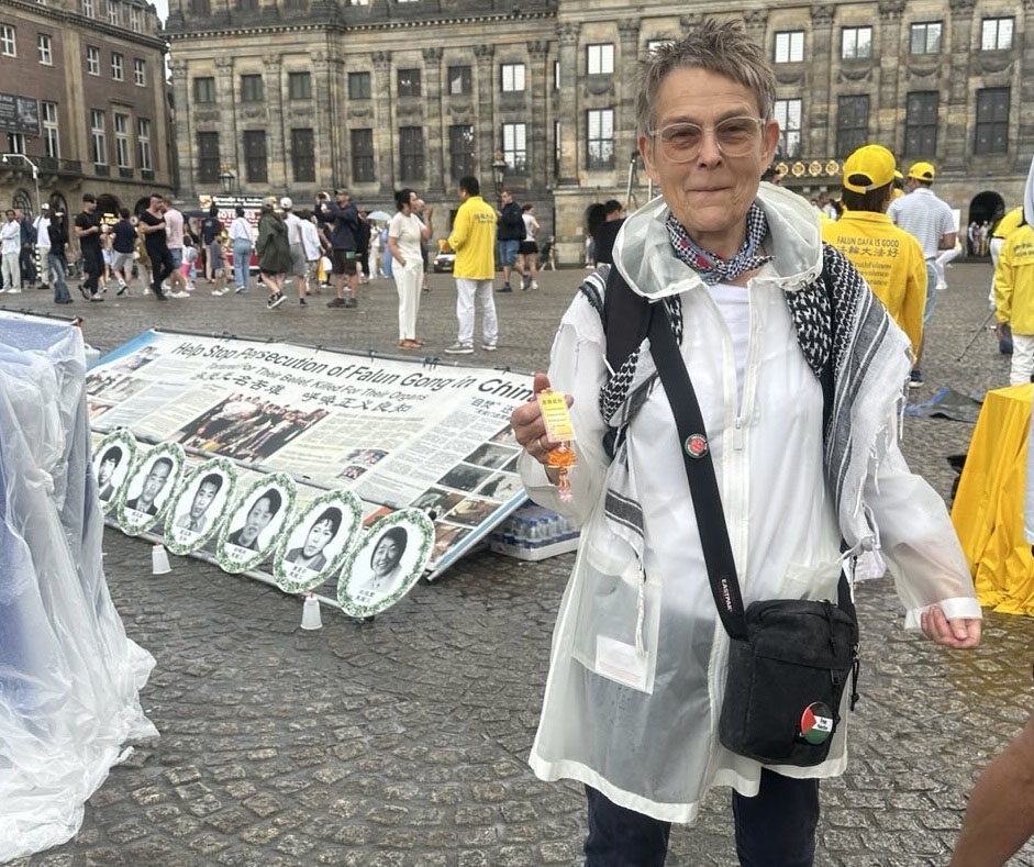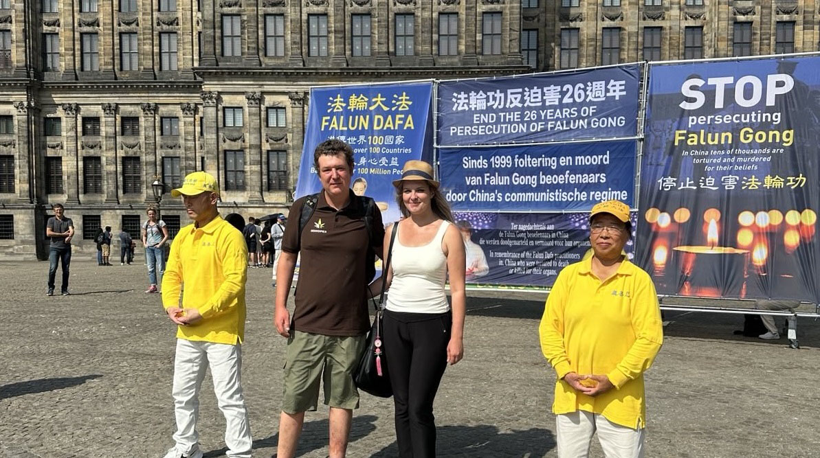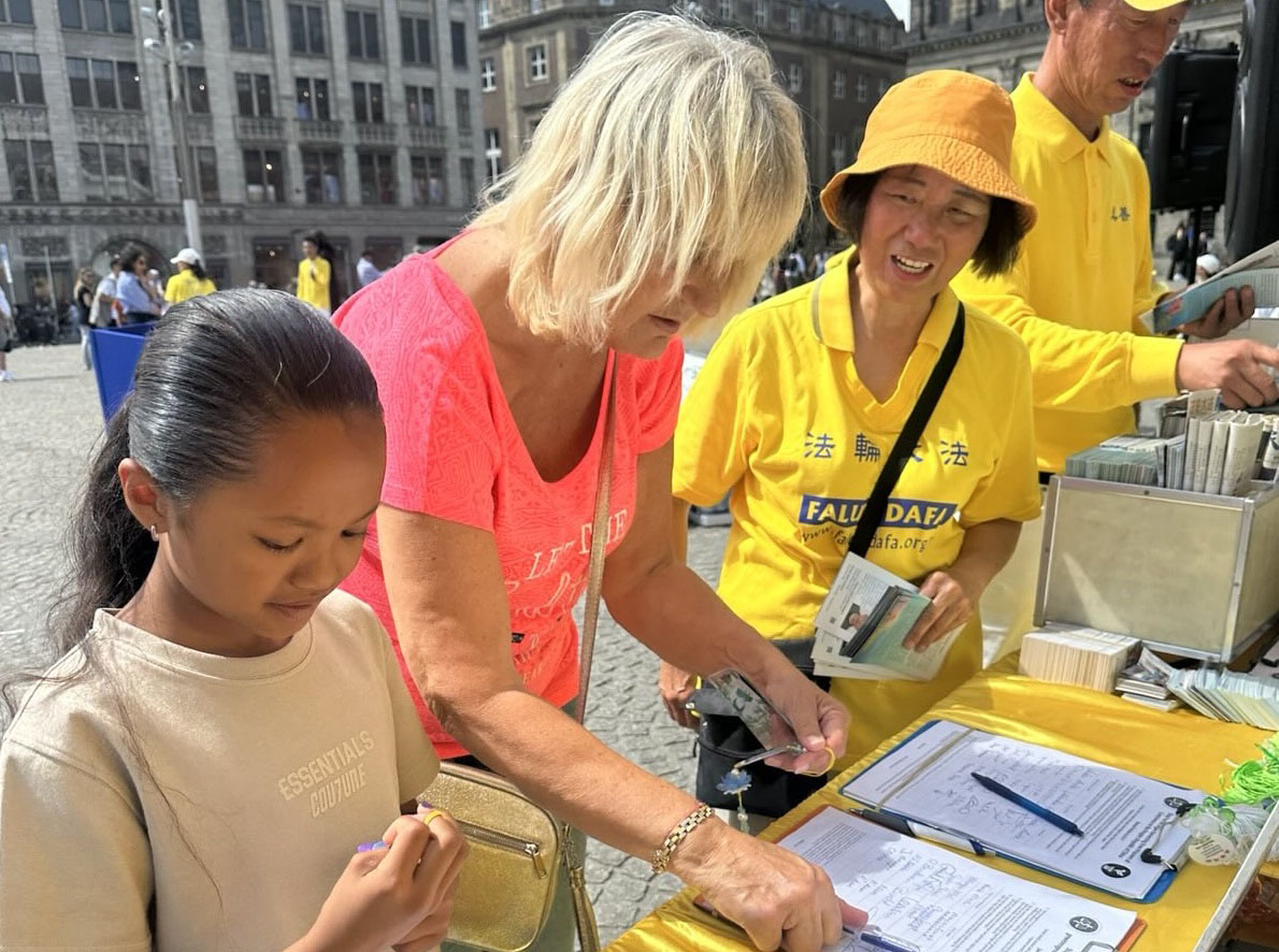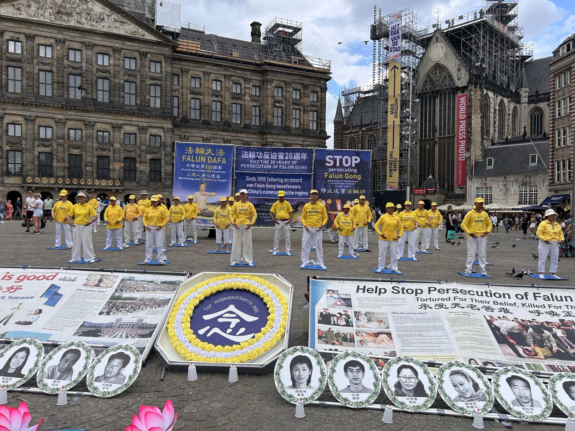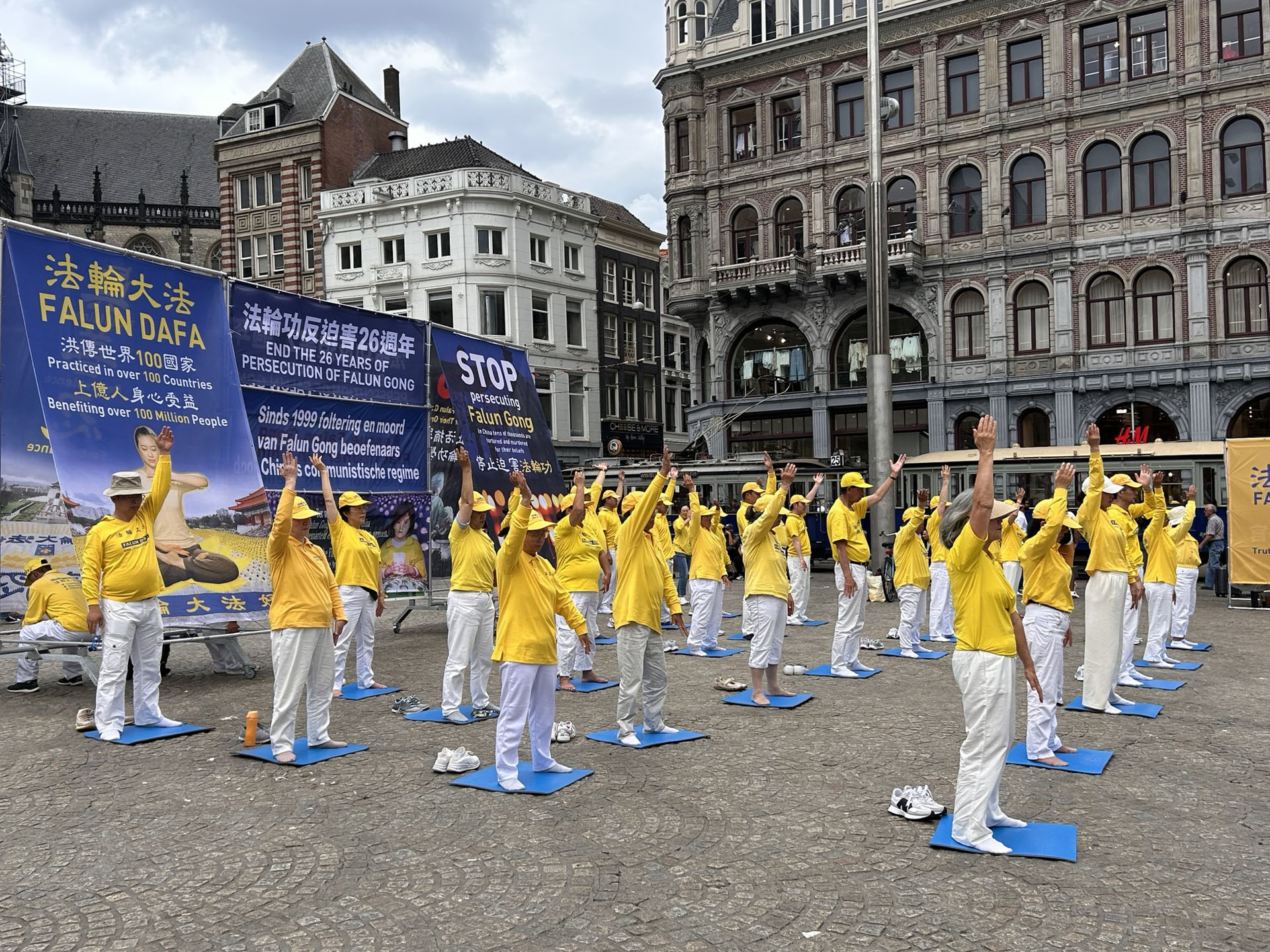Falun Gong praktikanti iz cijele Holandije su se okupili na Trgu Dam u glavnom gradu Amsterdamu 20. jula 2025. godine. Oni su demonstrirali vježbe, govorili ljudima o progonu, prikupljali potpise za peticiju i odali počast kolegama praktikantima koji su izgubili živote tokom progona od strane Komunističke partije Kine (KPK). Pozvali su KPK da okonča svoju 26-godišnju kampanju progona, diskriminacije, torture i transnacionalne represije nad Falun Gong.