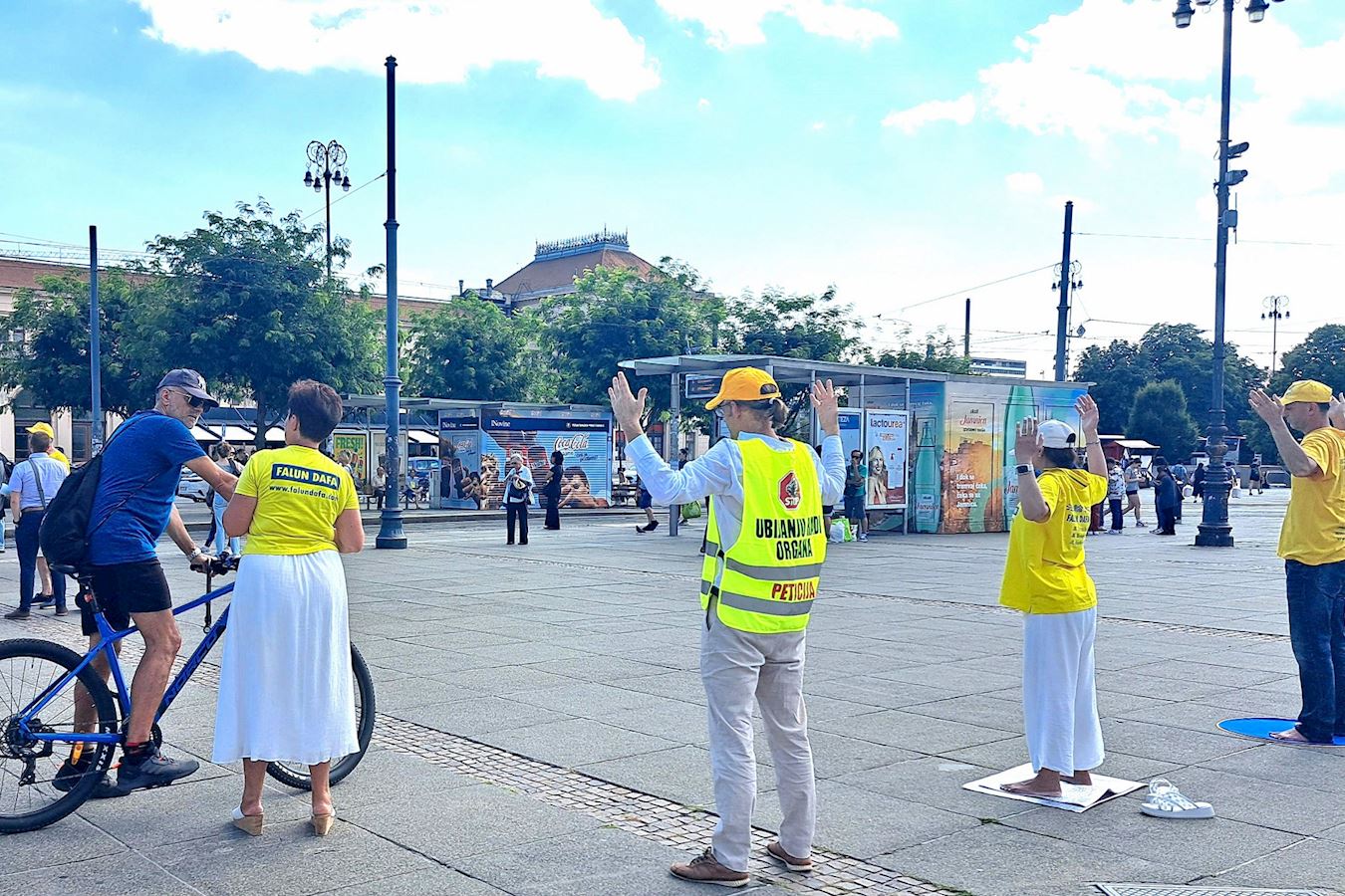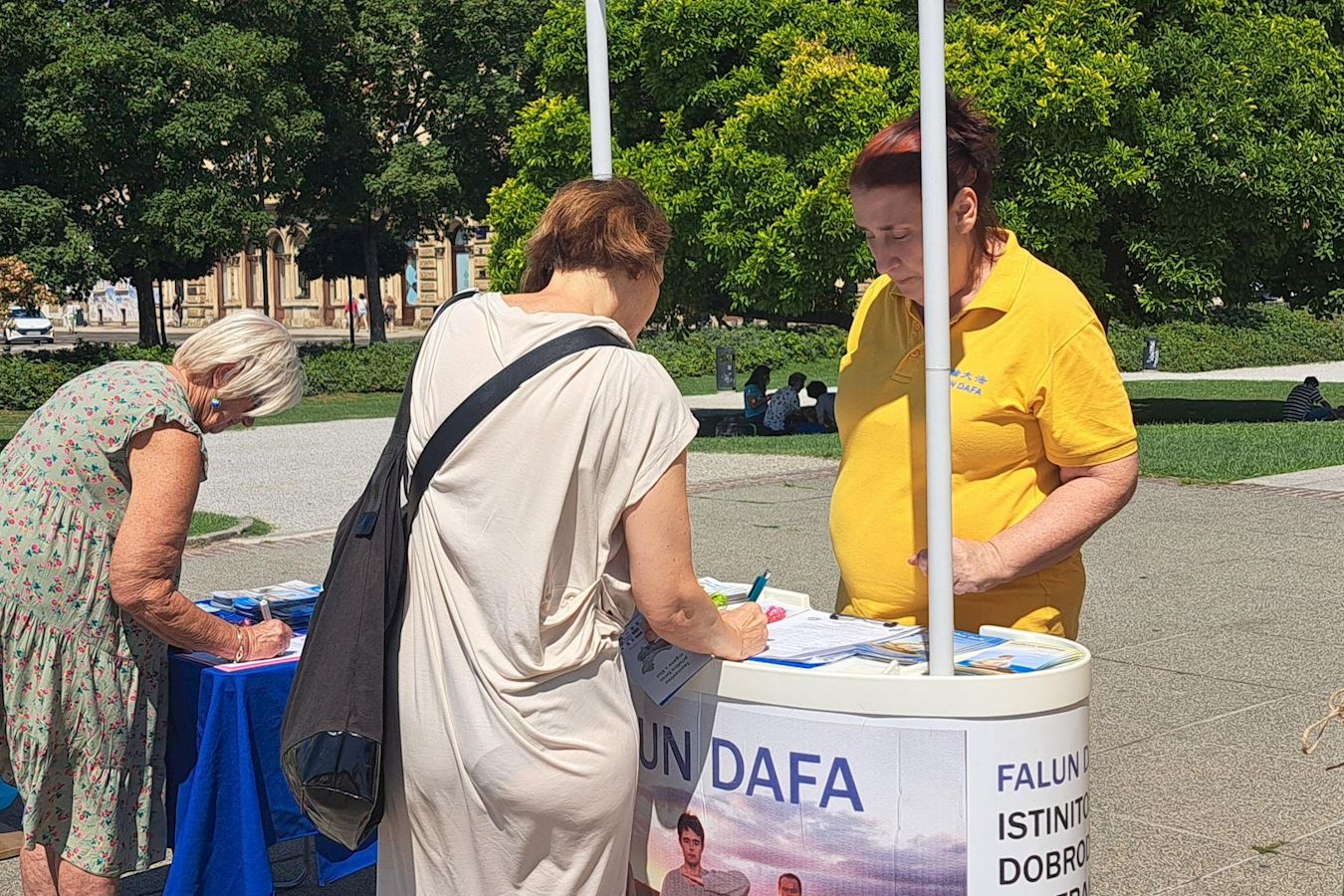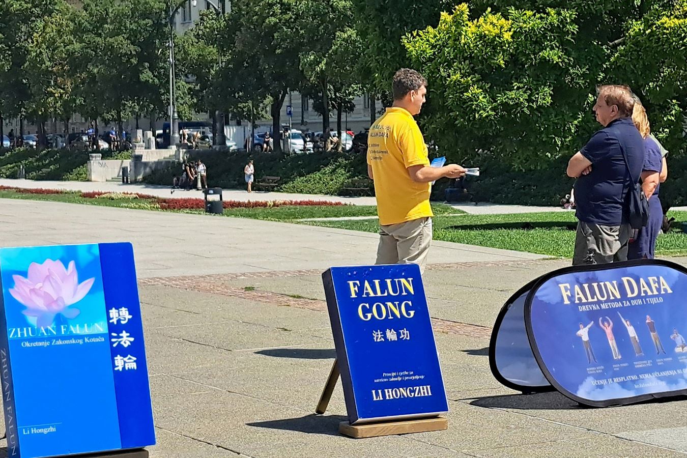 Praktikanti su postavili štand na Trgu kralja Tomislava u centru grada oko 9 sati ujutro. Jarko žuti šator i plavi transparenti privukli su pozornost ljudi na poruke na engleskom i kineskom jeziku, na kojima je pisalo: „Zaustavite progon Falun Gonga.“