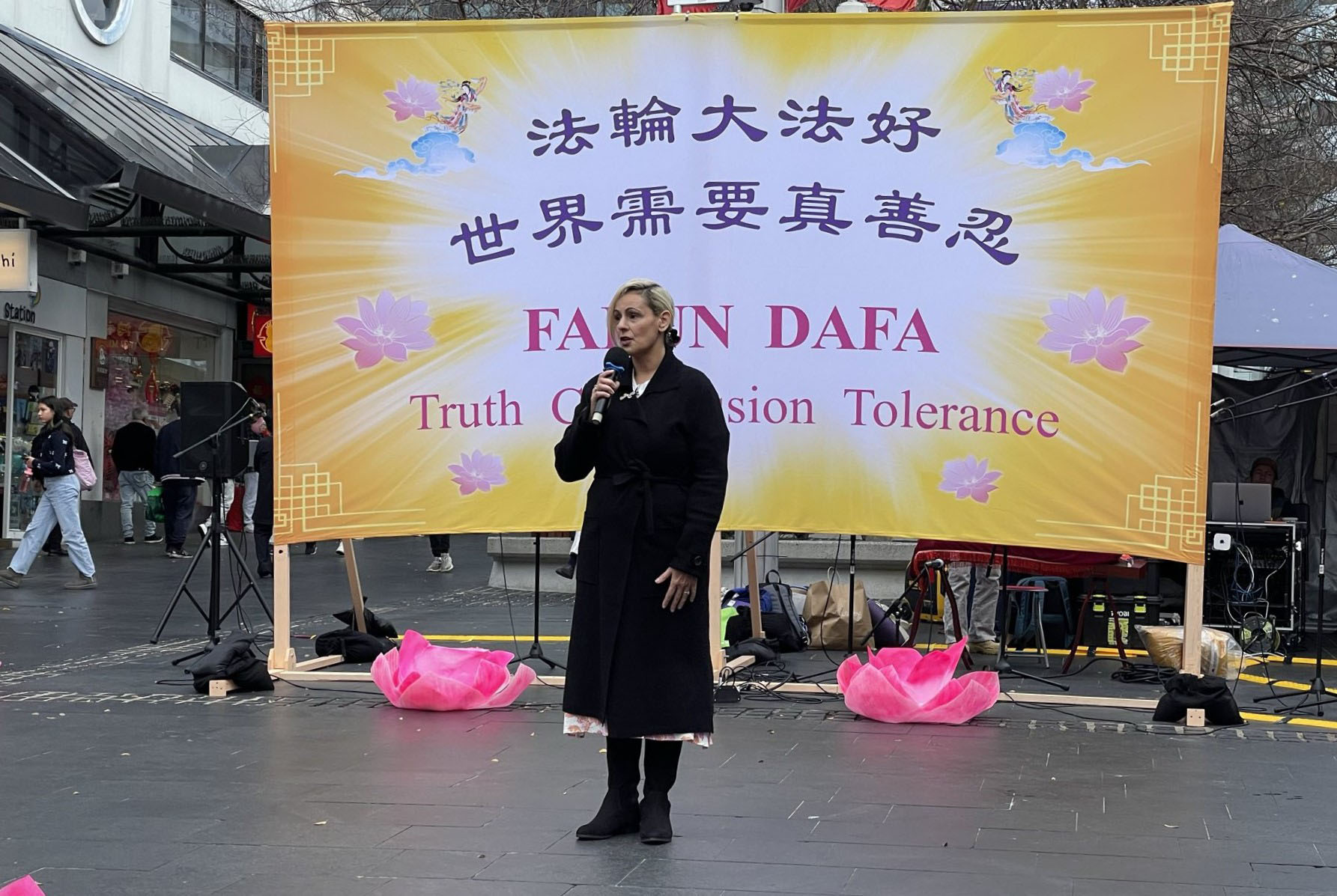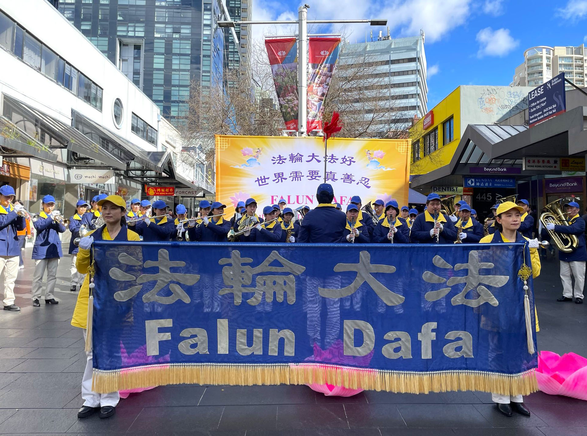 „Danas slavimo napore Falun Dafa praktikanata ovdje u Chatswoodu. Oni svako jutro vježbaju meditaciju i vježbe u dvorištu Concourse, nudeći besplatne časove javnosti. Oni se također pridružuju uličnim sajmovima i paradama koje organizira Vijeće Willoughbyja i predstavljaju kineske kulturne nastupe kao što ćete vidjeti i danas ovdje, uključujući veličanstveni Tian Guo Marching Band koji čine praktikanti, od kojih su mnogi bili progonjeni, ili su članovi njihovih porodica trpjeli progon u Kini zbog svojih uvjerenja.