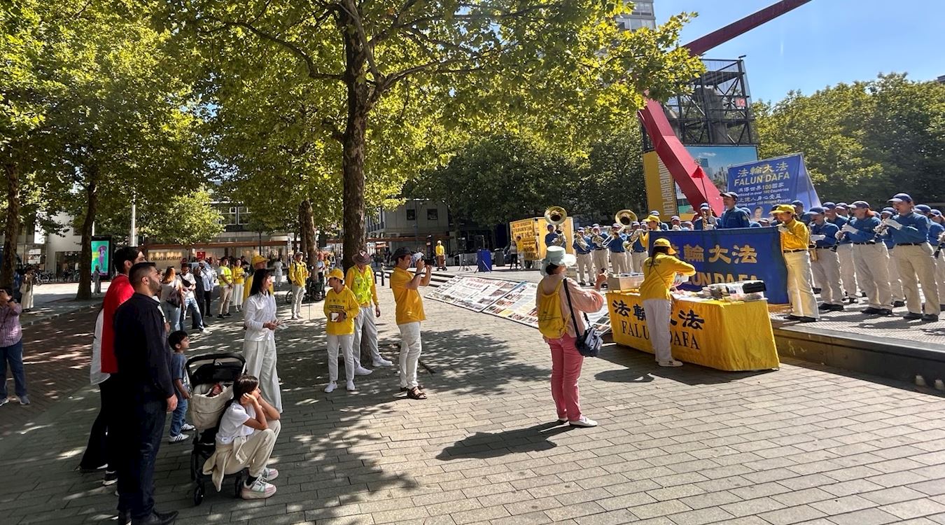 Praktikanti su marširali u Roterdamu 9. avgusta 2025. Tian Guo Marching Band, koji čine praktikanti iz evropskih zemalja, uključujući Nemačku, Belgiju, Veliku Britaniju, Francusku i Holandiju, nastupio je na maršu.