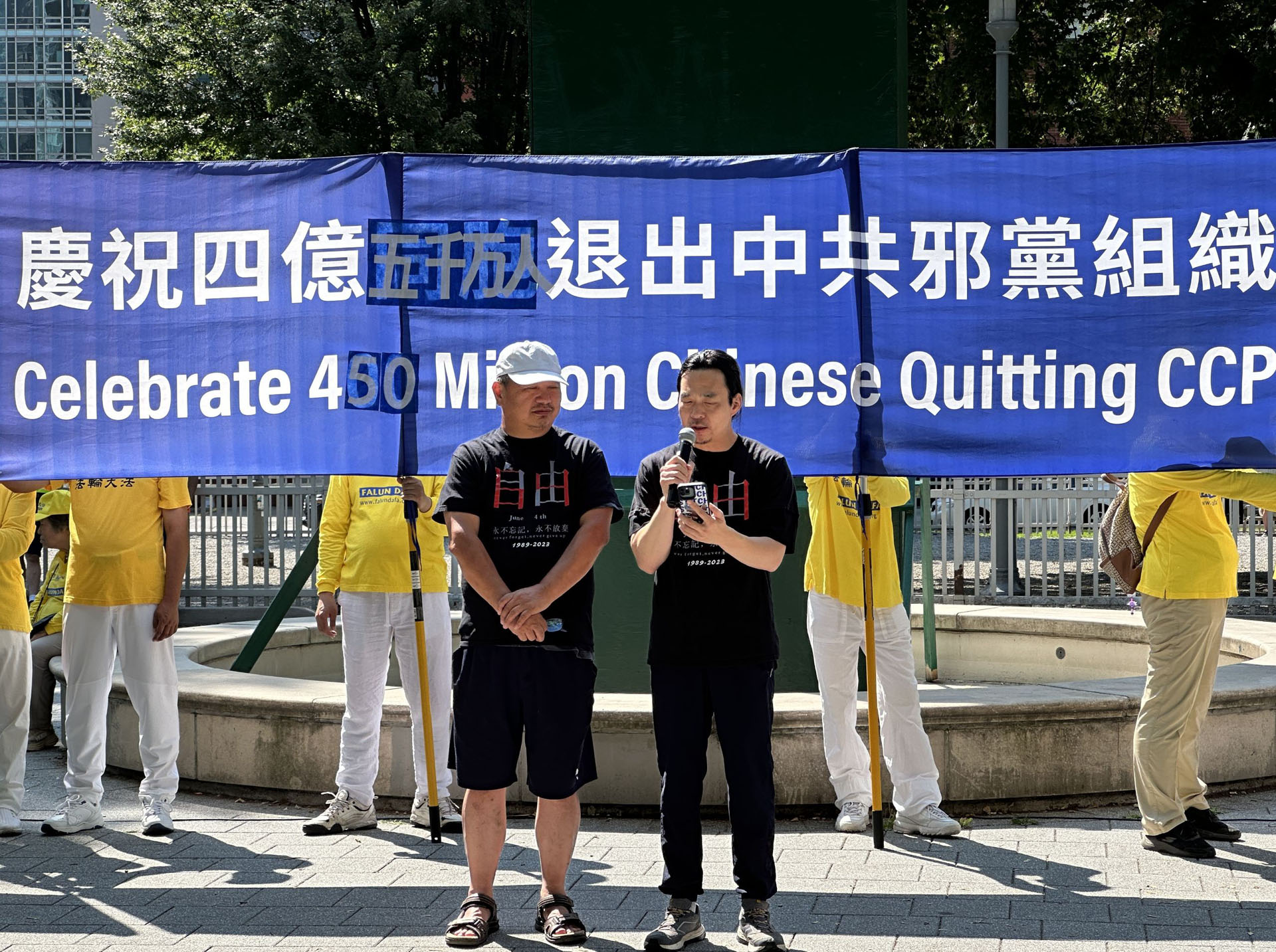 Praktikanti Falun Dafa u Torontu održali su skup u parku Clarence Square u blizini Kineske četvrti 16. kolovoza 2025. kako bi čestitali 450 milijuna Kineza koji su istupili iz Komunističke partije Kine (KPK) i njezinih omladinskih organizacija. Odali su počast svima koji su hrabro donijeli ovaj izbor i pozvali su sve sektore kanadskog društva da pomognu u zaustavljanju transnacionalne represije KPK nad praktikantima Falun Dafa koji žive u Kanadi. Ljudi iz svih sfera života govorili su na skupu, izražavajući svoju podršku i zahvalnost za mirni prosvjed praktikanata Falun Dafa, posebno u pomaganju javnosti da shvati pravu prirodu KPK.