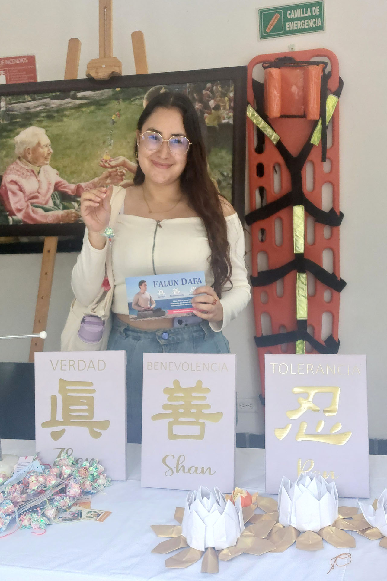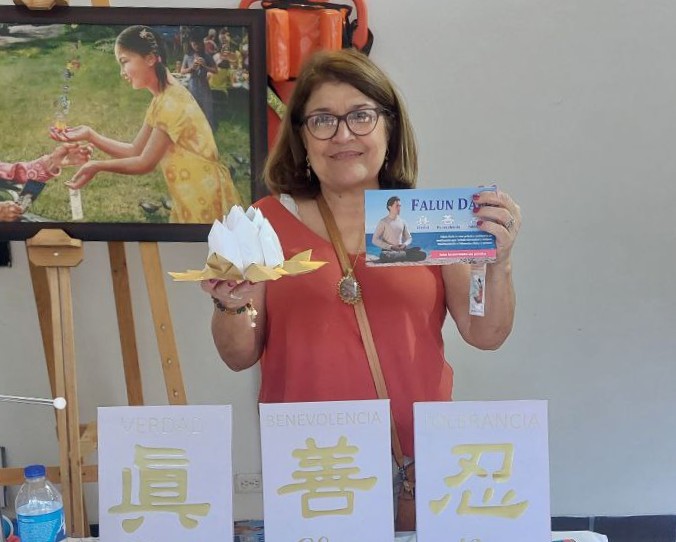 Druga posjetiteljica, gospođa Carolina, je rekla da joj je učenje pravljenja origami cvijeća bilo korisno i dalo joj osjećaj smirenosti i unutrašnjeg mira, što pripisuje Falun Dafa. "Mislim da je to aktivnost koja mnogo koristi duši, omogućavajući mir i spokoj", rekla je. "Nadam se da će više ljudi moći sudjelovati u ovome i naučiti o ovoj sjajnoj meditacijskoj praksi."