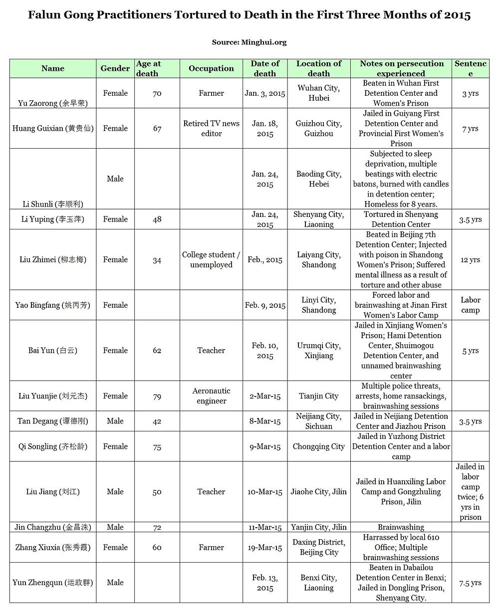 U prva tri mjeseca 2015. potvrđeno je 14 smrtnih slučajeva Falun Gong praktikanata koji su preminuli uslijed mučenja u pritvoru.