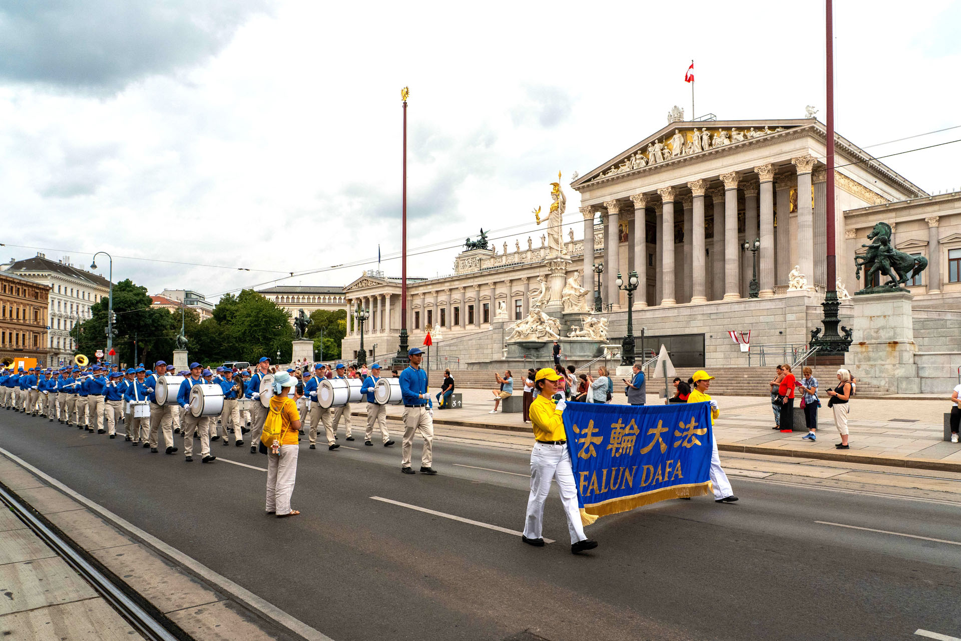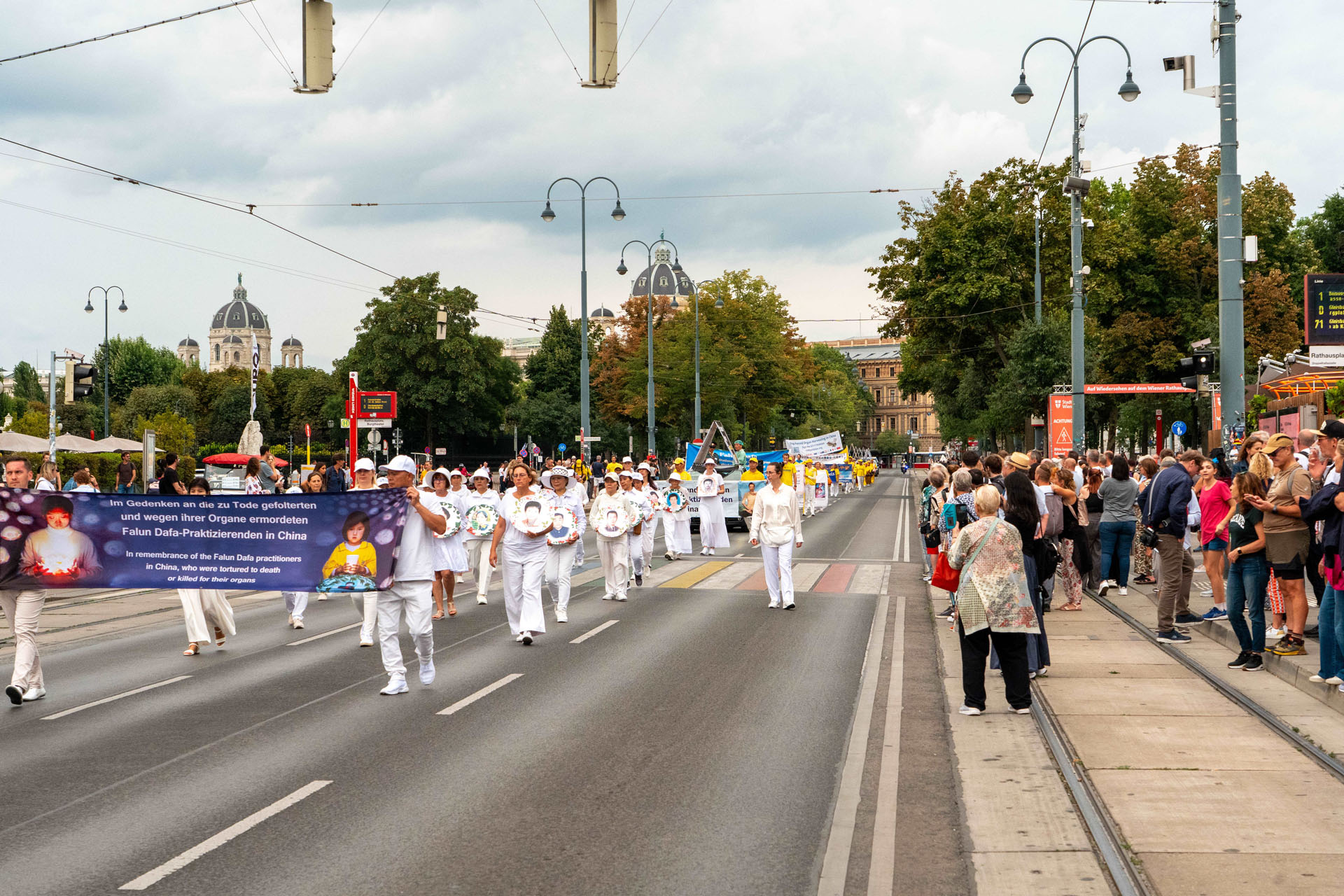 Marš je predvodio marširajući orkestar Tian Guo Marching Band. Praktikanti su demonstrirali vježbe i nosili transparente s informacijama o Falun Dafa. Dame odjevene u bijelo nosile su vijence s fotografijama praktikanata koji su izgubili živote tijekom progona od strane Komunističke partije Kine (KPK). Kada su saznali za brutalnost KPK, posebno za prisilno vađenje organa, mnogi ljudi su potpisali peticije kojima se poziva na prekid represije.