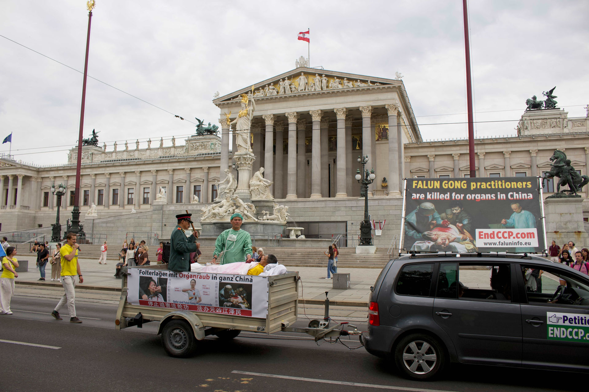 Osim što su ljudima govorili o dobrobitima Falun Dafa, putem plakata i govora na Helmut-Zilk-Platz-u, praktikanti su također objasnili kako KPK proganja praktikante 26 godina.
