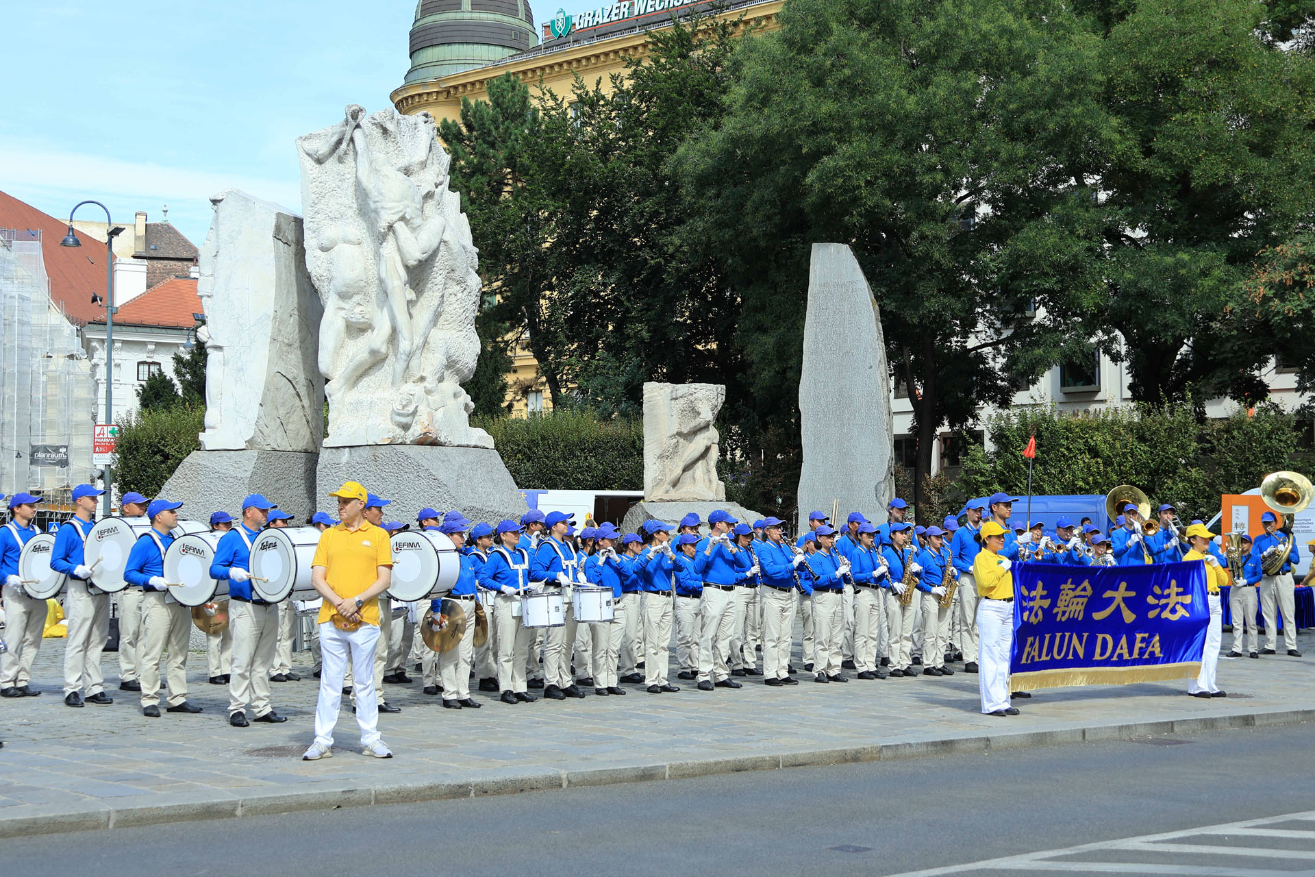 Praktikanti su demonstrirali vježbe, a marširajući orkestar Tian Guo Marching Band nastupio je na Helmut-Zilk-Platz-u.