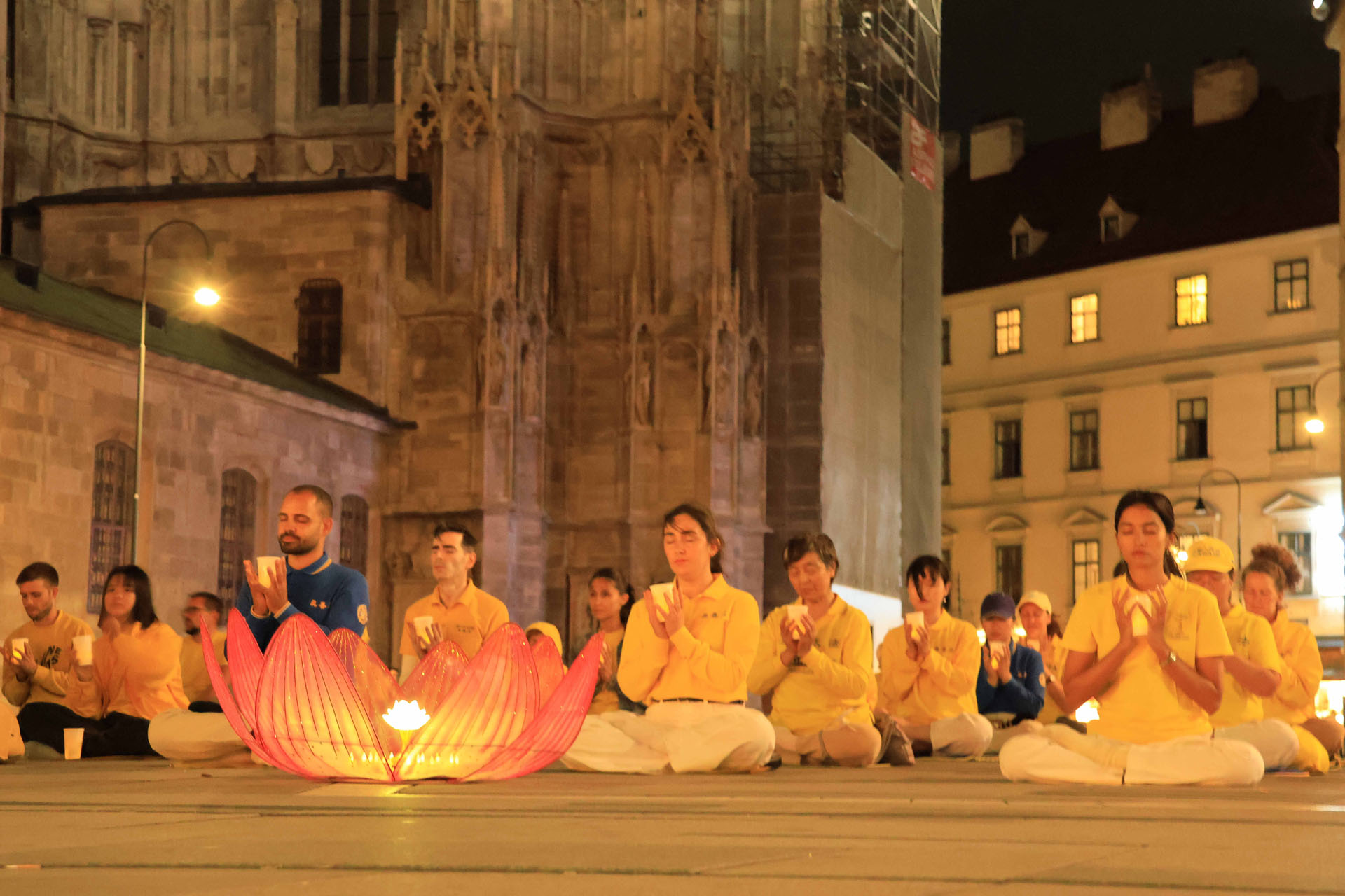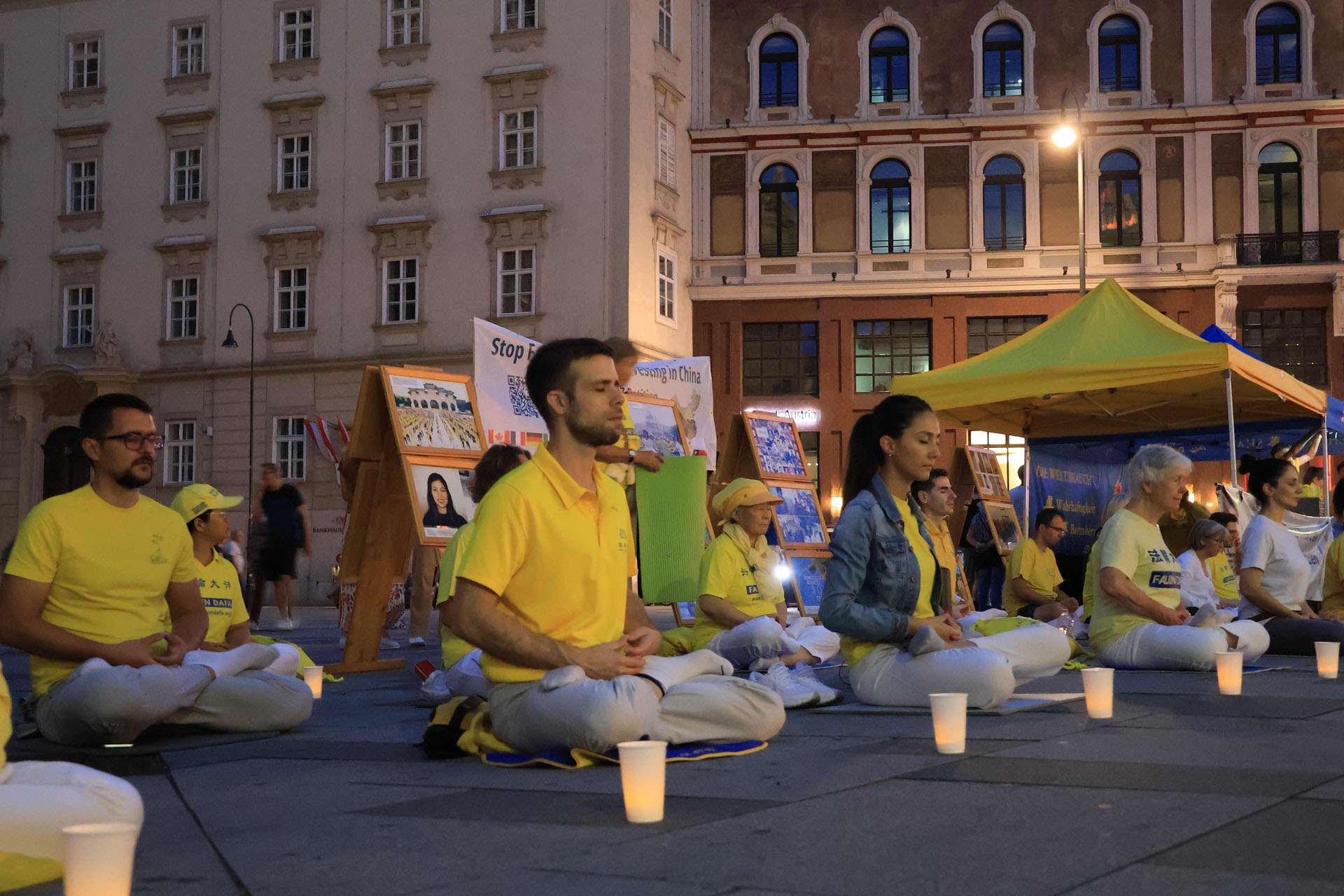 Praktikanti iz više od 10 evropskih zemalja su demonstrirali Dafa vježbe na Stephansplatzu, u Beču, uveče 29. augusta 2025. godine, kako bi predstavili Falun Gong (Falun Dafa). Te večeri, su održali bdijenje uz svijeće u spomen na praktikante koji su izgubili živote tokom 26 godina dugog progona.
