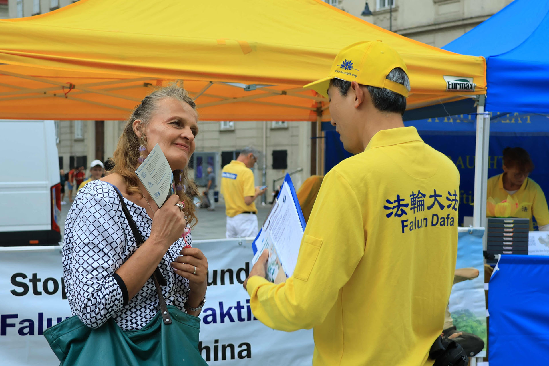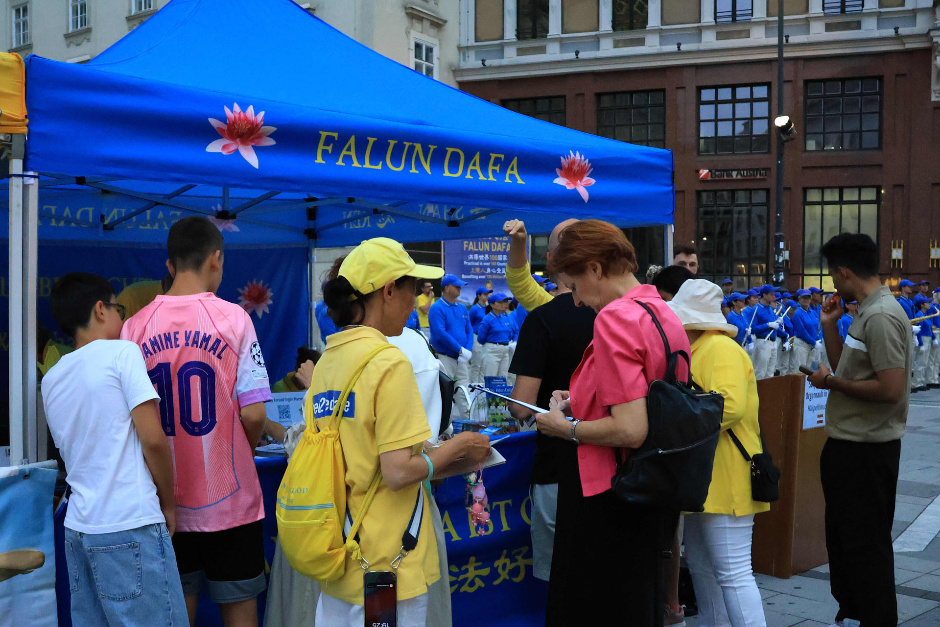 Katedrala Svetog Stefana, koja se uzdiže iznad trga Stephansplatz, je nezaobilazna destinacija za turiste. To je također popularno mjesto gdje se okupljaju mještani i trg je čak prometan i noću. Ljudi koji su prolazili trgom su pažljivo slušali govore praktikanata kako bi saznali o progonu u Kini; neki su uzimali letke i postavljali pitanja; drugi su gledali fotografije koje su prikazivale razne mirne aktivnosti održane tokom proteklih 26 godina kako bi se razotkrile brutalnosti; neki su došli do privlačnog plavog šatora da uzmu više materijala. Ljudi su potpisali peticiju koja poziva Komunističku partiju Kine (KPK) da prestane progoniti Falun Gong i vršiti žetvu organa od njih.