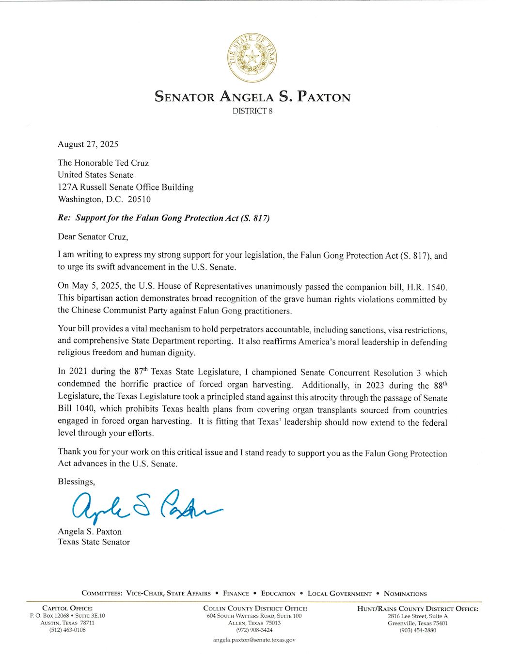 Senatorica Angela Paxton je u svom pismu napisala: „2021. godine, tijekom 87. zakonodavnog tijela države Teksas, podržala sam Konkurentnu rezoluciju Senata 3 koja je osudila užasnu praksu prisilnog vađenja organa. Nadalje, 2023. godine, tijekom 88. zakonodavnog tijela, zakonodavno tijelo Teksasa zauzelo je principijelan stav protiv ove grozote usvajanjem Prijedloga zakona Senata ata 1040, koji zabranjuje teksaškim zdravstvenim planovima pokrivanje transplantacija organa nabavljenih iz zemalja uključenih u prisilno vađenje organa. Prikladno je da se vodstvo Teksasa sada proširi na saveznu razinu kroz vaše napore.“