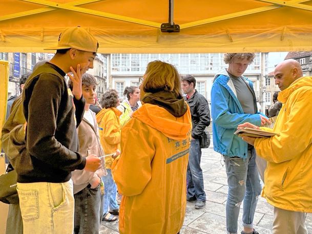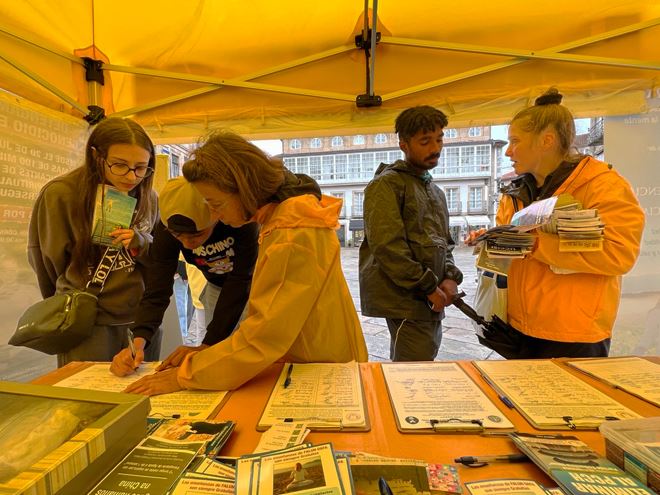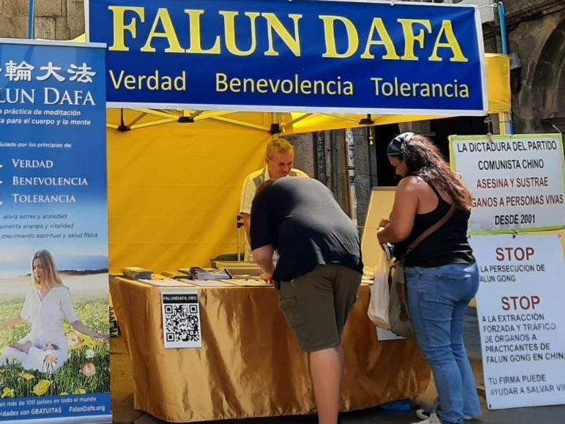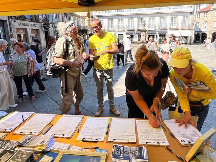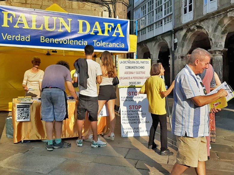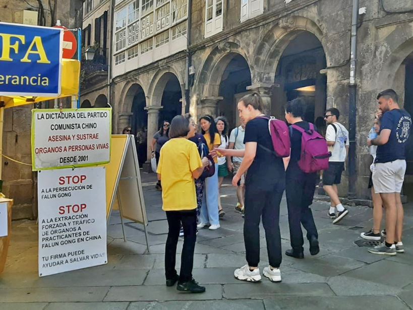 Falun Dafa praktikanti u Španiji održali su događaj u Santjago de Komposteli na severozapadu Španije, 23. i 29. avgusta 2025, kako bi podigli svest o progonu koji sprovodi Komunistička partija Kine (KPK) u Kini. Postavili su štand na Praza do Toural u centru grada, razgovarali o Falun Dafi i prikupljali potpise za peticiju kojom se poziva na okončanje progona. Trg je okružen zgradama iz 18. i 19. veka i povezuje starije i novije delove grada. To je popularno mesto okupljanja za meštane, turiste i hodočasnike koji prolaze Putem Svetog Jakova (Camino de Santiago).