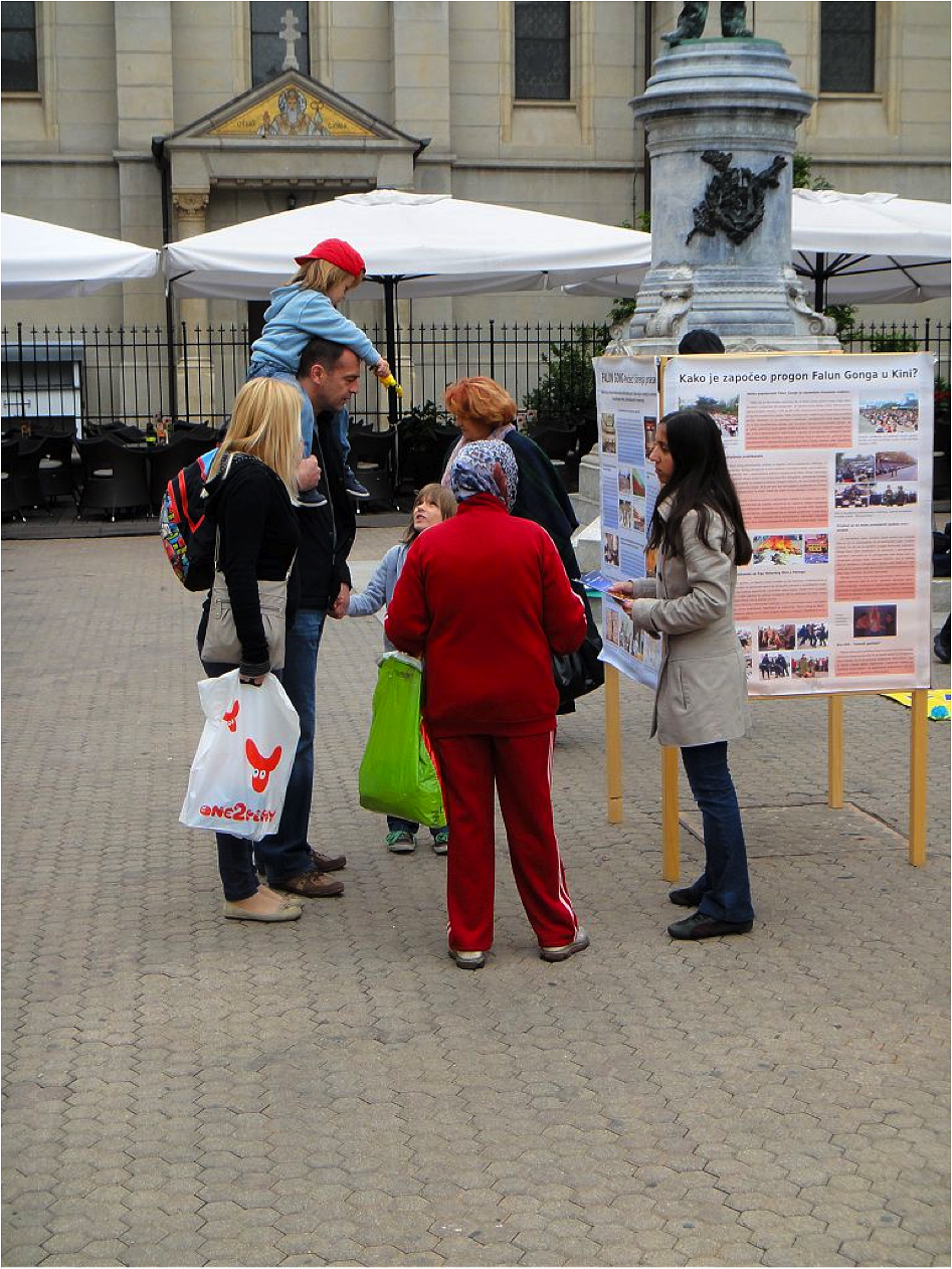 Brojni turisti su bili u posjeti glavnom gradu preko vikenda i mnogi su zainteresirano gledali žute postere, papirnato lotosovo cvijeće u raznim bojama i praktikante koji su vježbali. Zaustavljali su se i razgovarali s praktikantima i uzimali letke na engleskom jeziku. Jedan bračni par iz Amerike je također bio u posjeti Zagrebu. Odbili su letak rekavši: „A gdje ćemo s njima? Tu smo na praznicima, samo smo u prolazu.“ Praktikantica je nastavila razgovarati s njima o Falun Gongu, o prirodi prakse i o brutalnom progonu od strane KPK. Gospodin je rekao da je već ranije čuo nešto o progonu, ali da nije baš znao točno o čemu se radi. Rekao je: „Vidite, nismo uzeli letke ali ste ipak proslijedili vašu poruku. Bravo! Nisam znao toliko detalja o situaciji u Kini, hvala vam!“