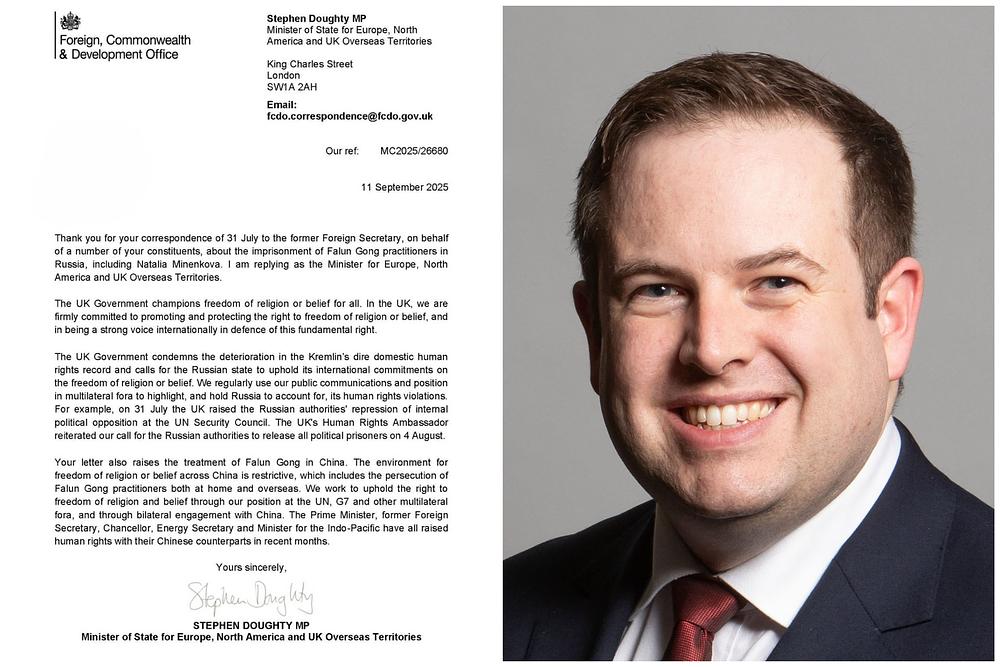 Zastupnik Stephen Doughty u svom je pismu izjavio: „Vlada Ujedinjenog Kraljevstva zagovara slobodu vjeroispovijesti ili uvjerenja za sve. U Ujedinjenom Kraljevstvu čvrsto smo predani promicanju i zaštiti prava na slobodu vjeroispovijesti ili uvjerenja te tome da budemo snažan glas na međunarodnoj razini u obrani ovog temeljnog prava.