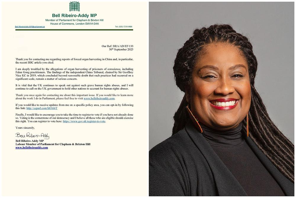 Zastupnica Bell Ribeiro-Addy u svom je pismu izjavila: „Duboko sam uznemirena navodima o vađenju organa nad zatvorenicima savjesti, među kojima su i Falun Gong praktikanti. Nalazi neovisnog Suda za Kinu, kojim je 2019. predsjedavao Sir Geoffrey Nice KC, izvan svake sumnje zaključili da se takve stvari događaju u masovnim razmjerima i iste nas čine izrazito zabrinutima.“