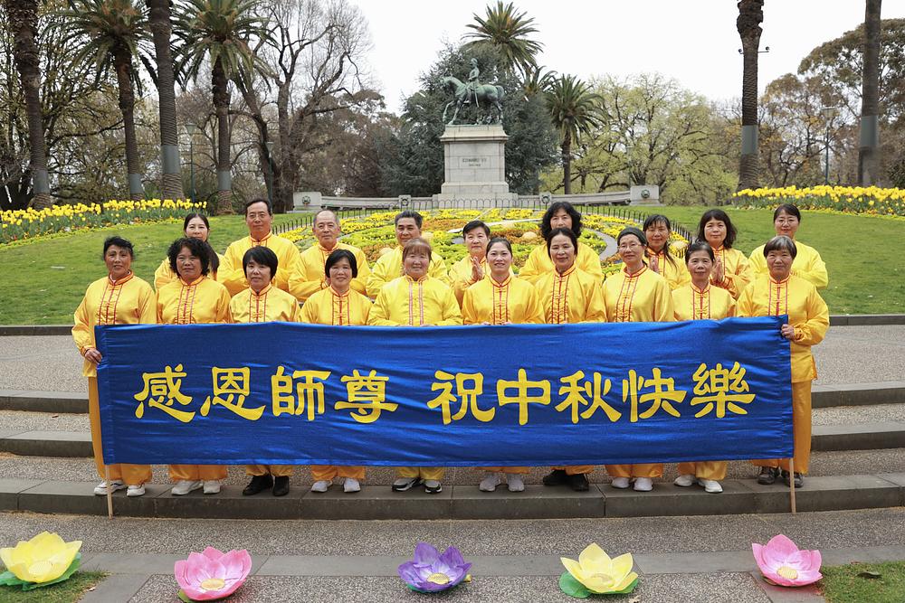 Uoči Praznika sredine jeseni 2025, 6. oktobra, praktikanti Falun Dafe su napravili grupnu fotografiju pored cvetnog sata u baštama kraljice Viktorije u Melburnu. Izrazili su zahvalnost svom osnivaču, Učitelju Li Hongdžiju.