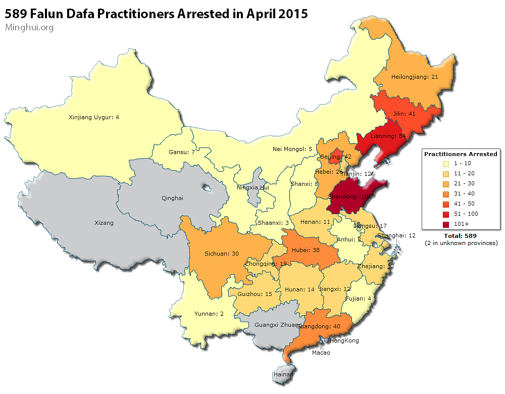 Tri provincije ili općine sa najvećim brojem hapšenja u travnju su Shandong (106), Liaoning (84) i Peking (42).