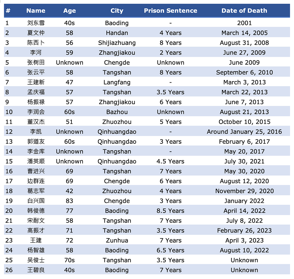 Jednom praktikantu po prezimenu Džao uskraćivan je san više od 20 uzastopnih dana. Odbio je da se odrekne svoje vere i nekoliko meseci je štrajkovao glađu. U bolnici je bio vezan lisicama go za krevet. Njegova porodica je obaveštena o njegovom stanju tek kada je bio u kritičnom stanju. Džao je preminuo mesec dana nakon puštanja na slobodu.