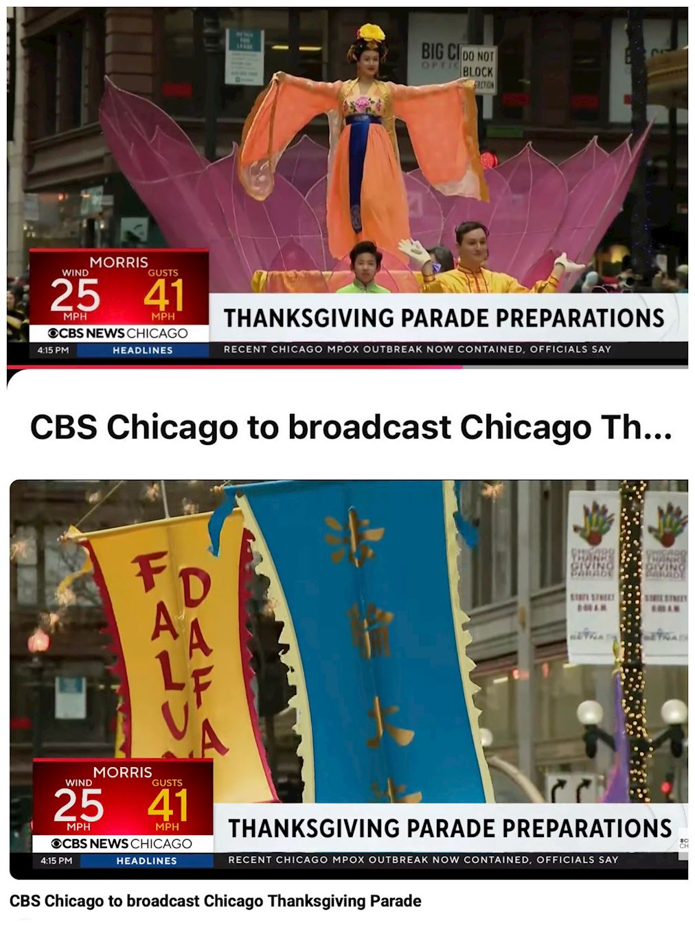 CBS Chicago je prenosio paradu uživo, Pluto TV ju je istovremeno emitovao, a canTV reprizirao, što je uveliko povećalo broj gledalaca parade. CBS Chicago, kao domaćin prenosa uživo, koristio je inserte Falun Dafa nastupa sa parade 2024. u svom trejleru od 34 sekunde.