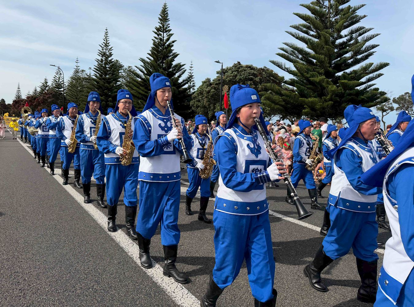 Gledaoci su toplim aplauzom pozdravili Tian Guo marširajući orkestar, sastavljen od Falun Dafa praktikanata sa Novog Zelanda i iz Australije. Ljudi su se fotografisali, hvalili orkestar zbog plavo-belih uniformi i rekli da se muzika orkestra savršeno uklopila u prazničnu atmosferu događaja. Upečatljivi transparenti „Istinitost-Blagost-Trpeljivost“ krasili su pokretnu platformu, koju je pratio tim zmajevog plesa, u čemu su deca zaista uživala.