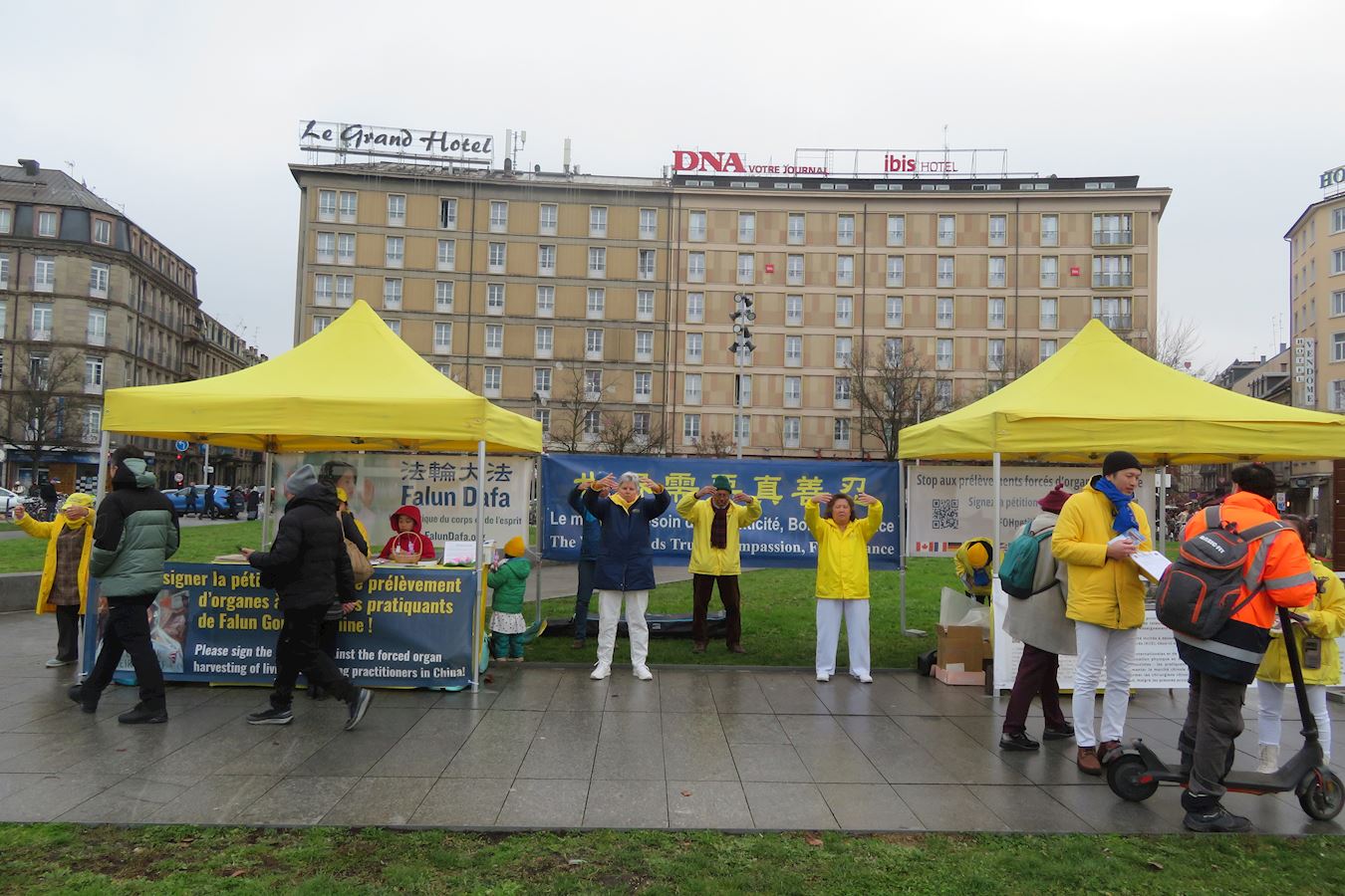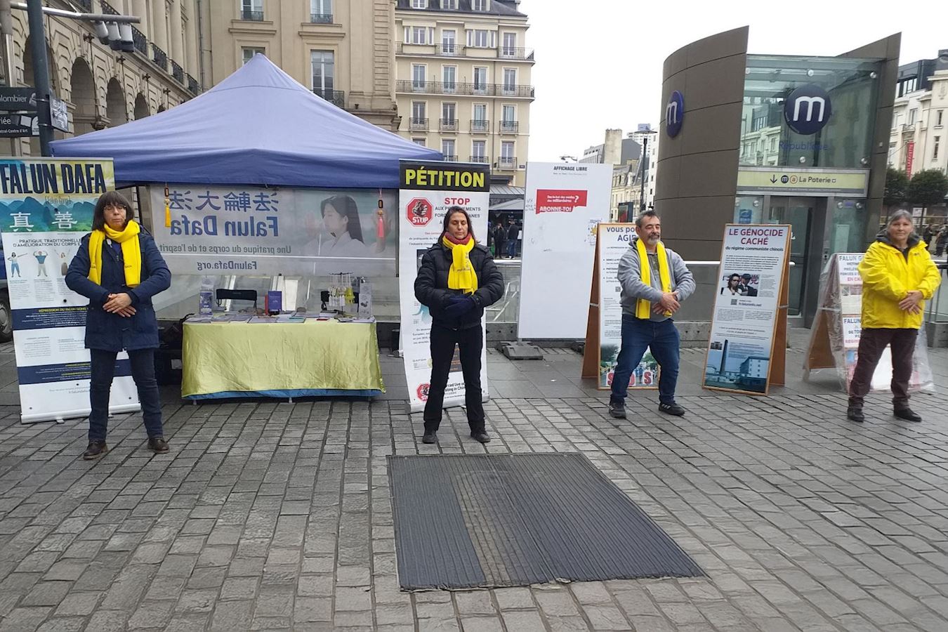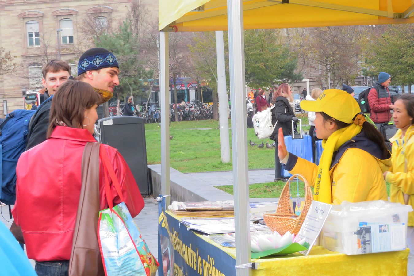 Iako je tog dana padala lagana kiša, te subote prije zimskog odmora, na Trgu Republike i dalje je bilo puno ljudi. Praktikanti su demonstrirali vježbe Falun Gonga i dijelili informacije prolaznicima. Demonstracija vježbi privukla je mnoge da se zaustave i fotografiraju. Neki su ljudi fotografirali i informativne ploče. Brojni su rekli da su bili dirnuti saznanjem o progonu i potpisali su peticiju protiv prisilnog vađenja organa. Mnogi su zahvalili praktikantima što su tamo.