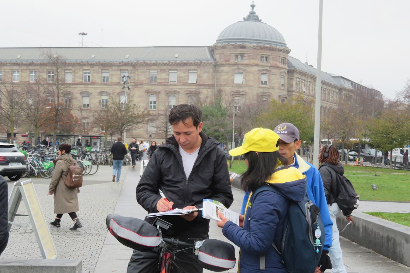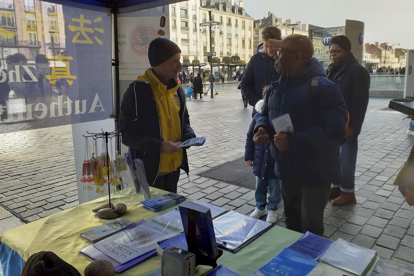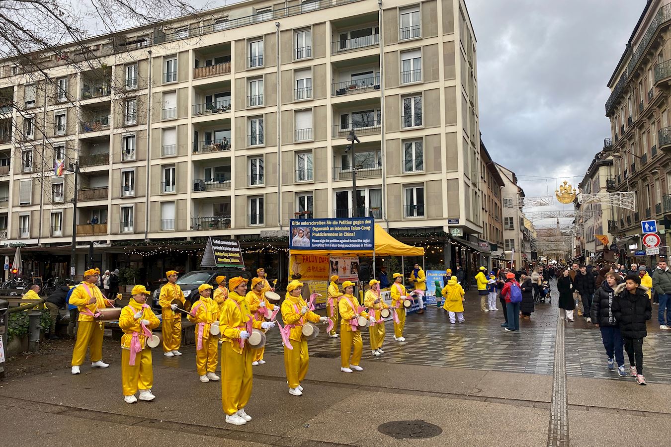 Iako je tog dana padala lagana kiša, te subote prije zimskog odmora, na Trgu Republike i dalje je bilo puno ljudi. Praktikanti su demonstrirali vježbe Falun Gonga i dijelili informacije prolaznicima. Demonstracija vježbi privukla je mnoge da se zaustave i fotografiraju. Neki su ljudi fotografirali i informativne ploče. Brojni su rekli da su bili dirnuti saznanjem o progonu i potpisali su peticiju protiv prisilnog vađenja organa. Mnogi su zahvalili praktikantima što su tamo.