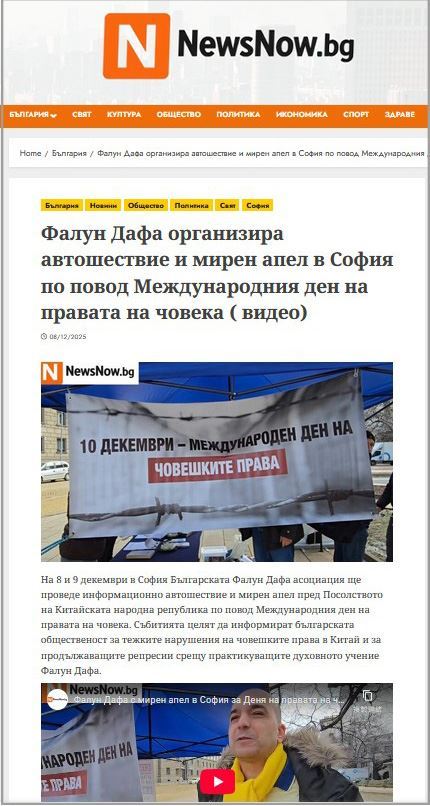 Tokom nedelje 10. decembra 2025. godine, na Međunarodni dan ljudskih prava, Bugarska Falun Dafa asocijacija (BFDA) organizovala je događaje u Sofiji kako bi obavestila ljude o tekućem progonu koji Komunistička partija Kine (KPK) sprovodi u Kini. Internet medij NewsNow.bg izvestio je o ovim događajima.
