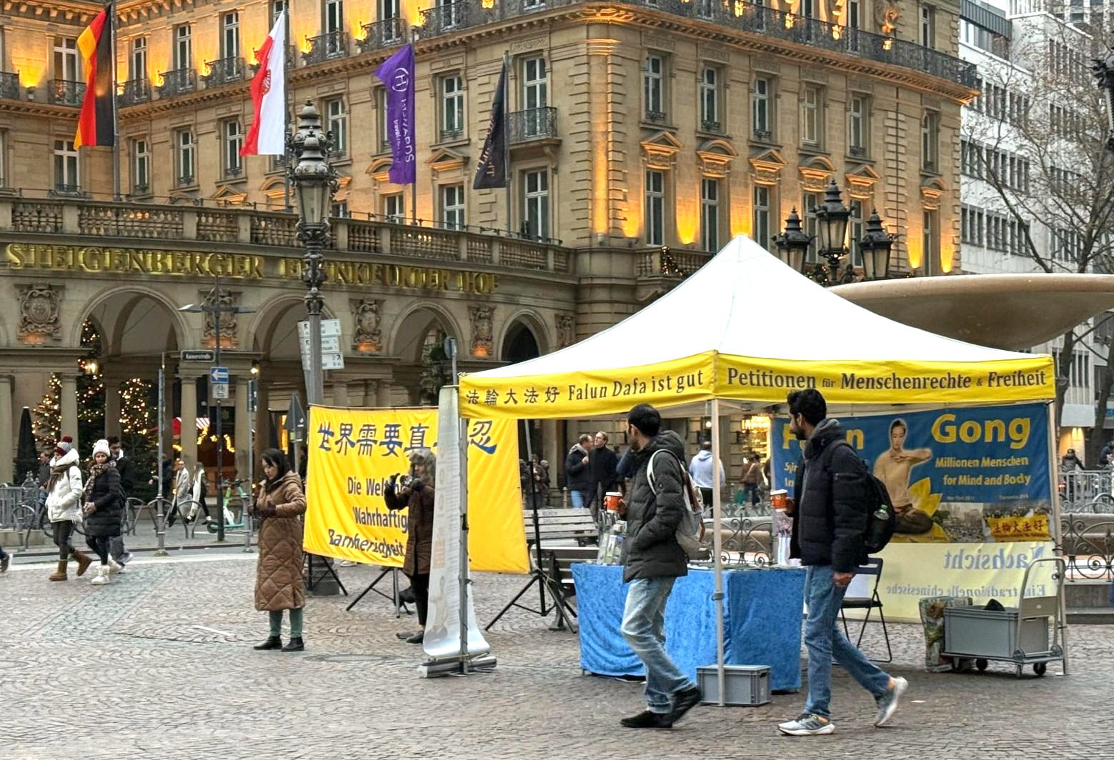 Praktikanti Falun Dafa održali su informativni dan u središtu Frankfurta 13. prosinca 2025. Dijelili su letke s informacijama o progonu od strane Komunističke partije Kine (KPK) i od države odobrenom prisilnom vađenju organa. Također su javnosti predstavili Falun Dafa (Falun Gong) i demonstrirali vježbe.