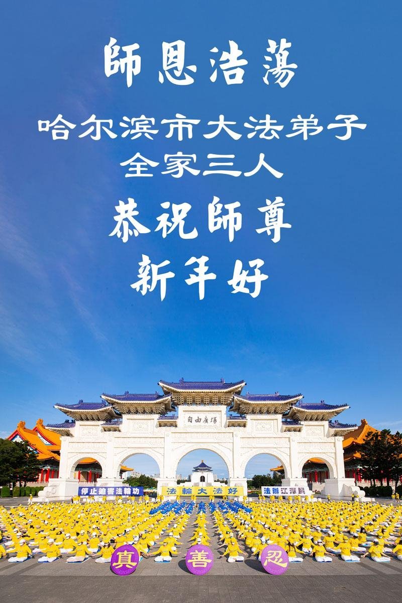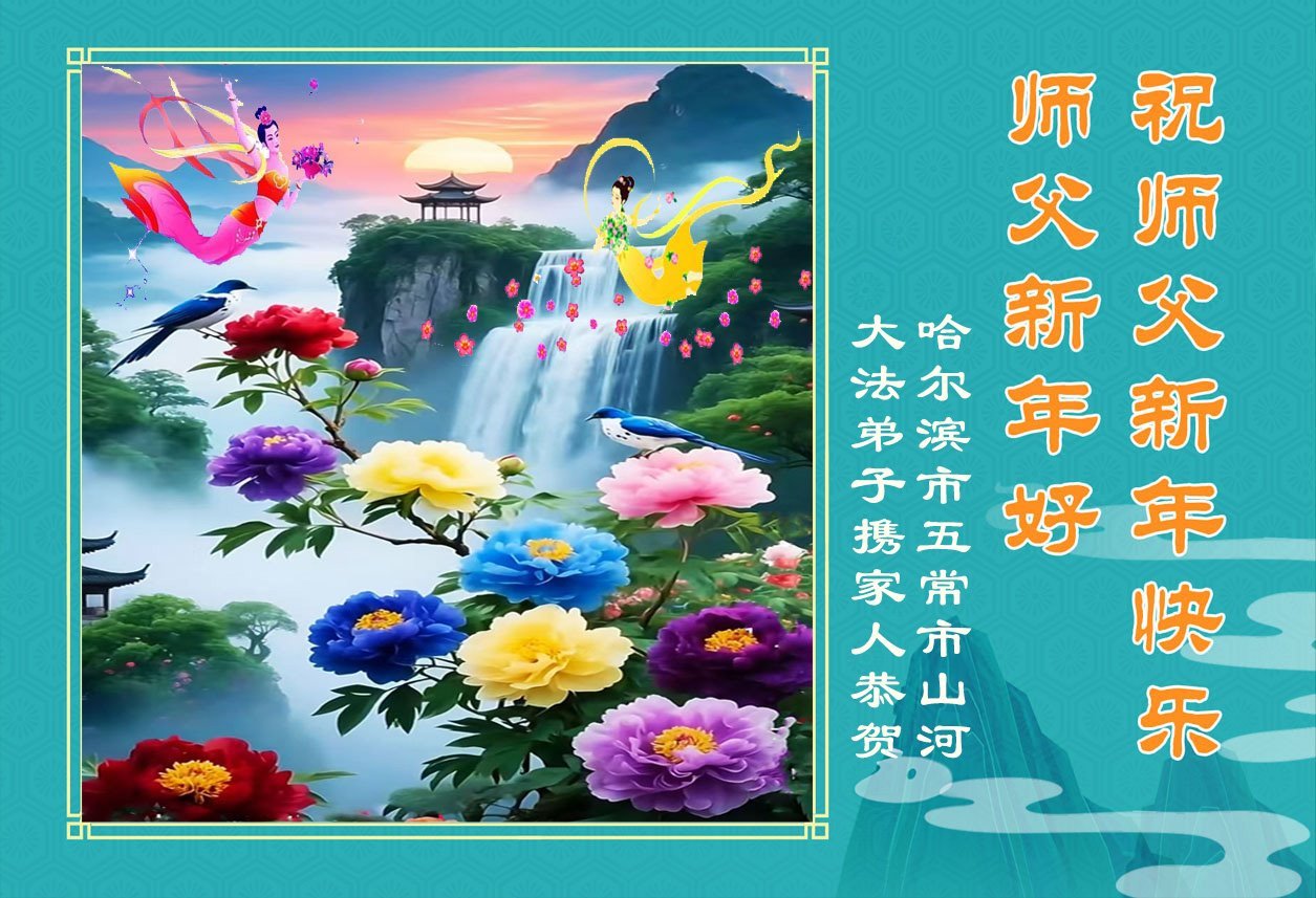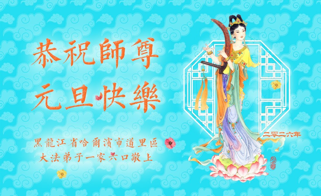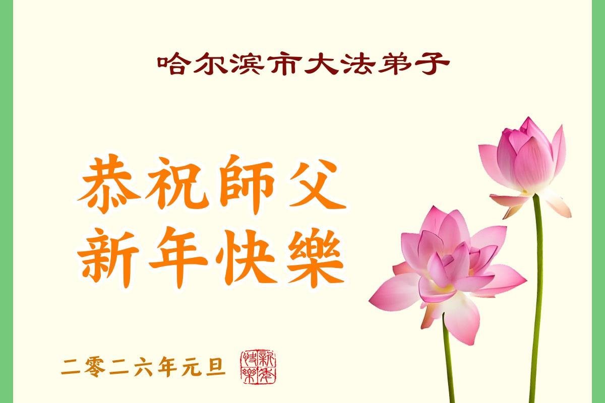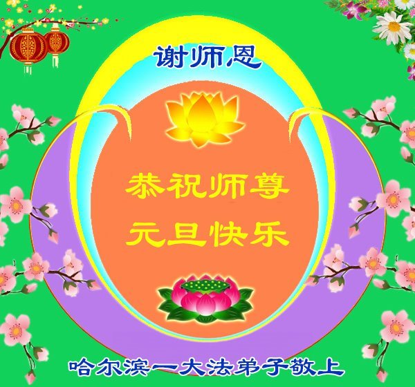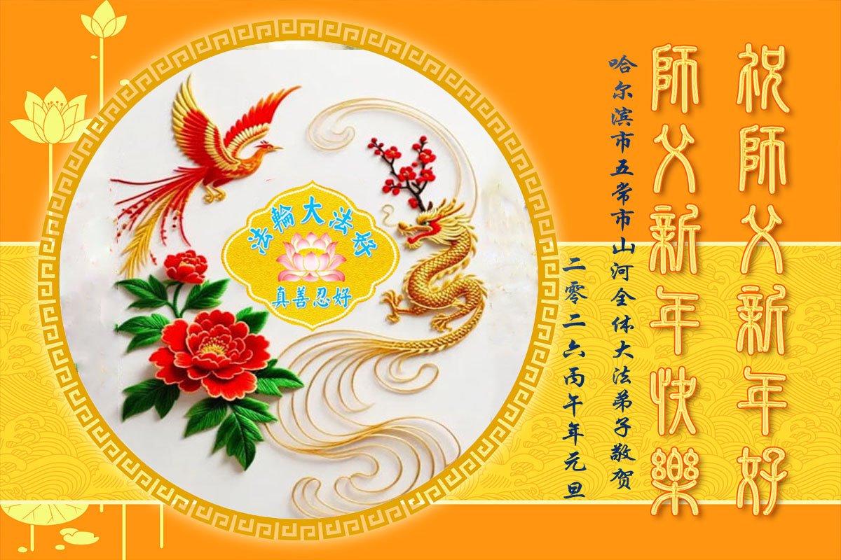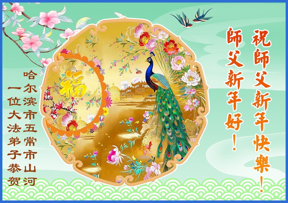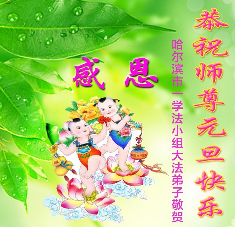 Falun Dafa praktikanti iz grada Harbina s poštovanjem žele Učitelju Li Hongdžiju srećnu Novu godinu (108 čestitki)