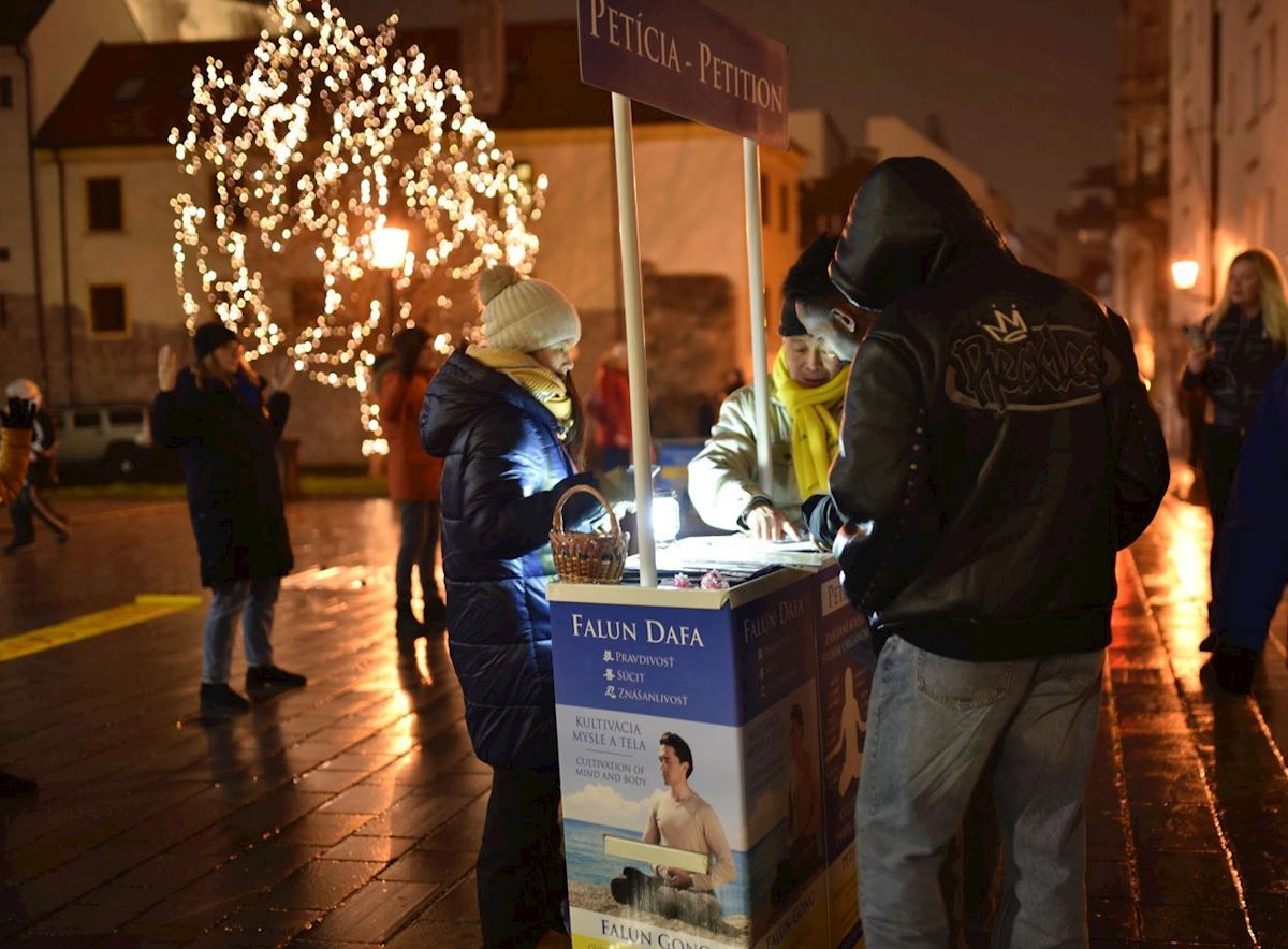 Anežka Vemkova, psiholog, koja se zaustavila kod štanda u Bratislavi, odlučila je da doda svoj potpis peticiji. Za progon je saznala od svog zeta. Rekla je: „Meditacija mi je bliska srcu i mislim da je važno da sloboda ljudi nije ograničena.“ Dodala je: „Vrednosti istinitosti, blagosti i trpeljivosti su veoma korisne za društvo.“