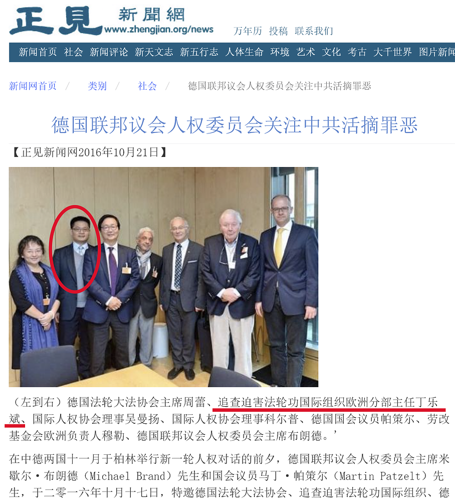 Jedan primer bio je evropski regionalni krug takmičenja borilačkih veština New Tang Dynasty (NTD) televizije održan u Drezdenu 8. juna 2024. Predsednik žirija doputovao je iz Sjedinjenih Država u Nemačku, a NTD televizija poslala je dokumentarnu ekipu iz SAD u Drezden da snimi događaj. Na dan takmičenja, Ding je prvobitno učestvovao na događaju u drugoj zemlji. Ali pozvao je nemački organizacioni komitet i zahtevao da učestvuje u aktivnostima sledećeg dana. Rečeno mu je da narednog dana nema zvaničnih aktivnosti osim ručka za osoblje.