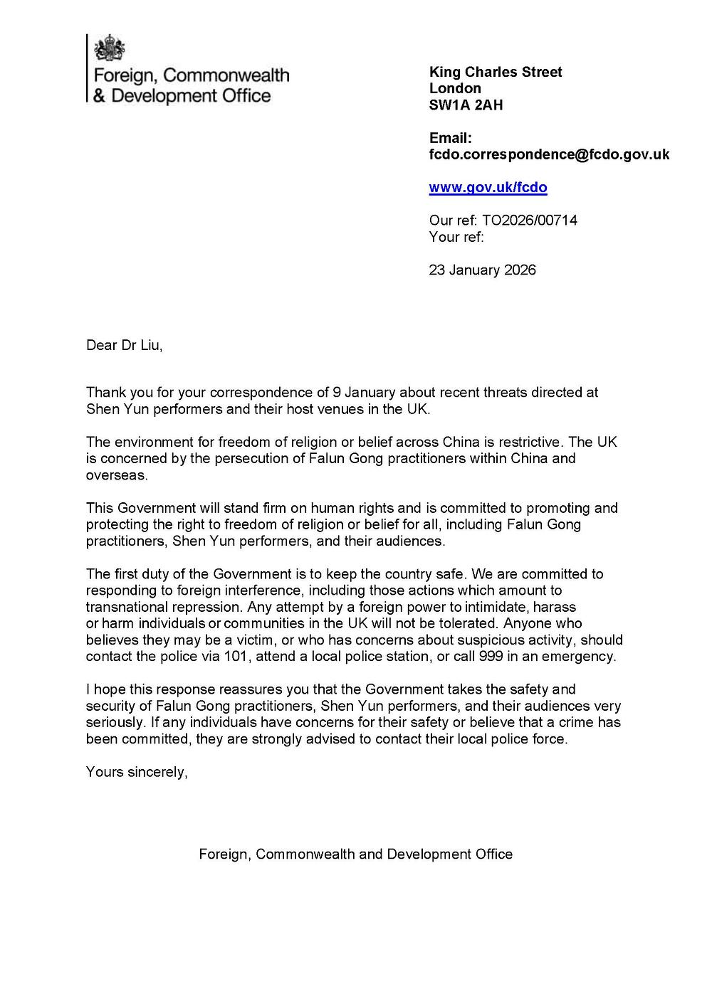 Falun Dafa UdrugaUjedinjenog Kraljevstva primila je 23. siječnja 2026. pismo podrške od Ministarstva vanjskih poslova, Commonwealtha i razvoja Ujedinjenog Kraljevstva (FCDO) kao odgovor na prijetnje usmjerene na turneju Shen Yun Performing Arts po Ujedinjenom Kraljevstvu 2026. Čini se da prijetnje dolaze od operativaca Komunističke partije Kine (KPK) i pokušaji su širenja dezinformacija i sprječavanja nastupa Shen Yuna u Ujedinjenom Kraljevstvu.