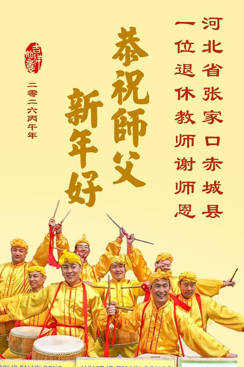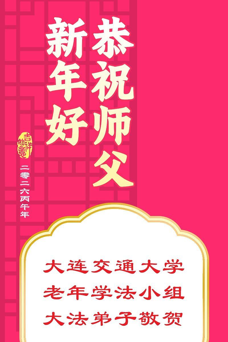 „Želimo Učitelju srećnu Novu godinu! Svi Dafa učenici razumeju svoju odgovornost. Iako su teškoće velike, mi racionalno i mudro koristimo različite načine da pomognemo u spasavanju više ljudi, ispunimo svoje zavete, završimo svoju misiju i dovedemo mnoga živa bića do ispunjenja dok se vraćamo kući sa Učiteljem.“