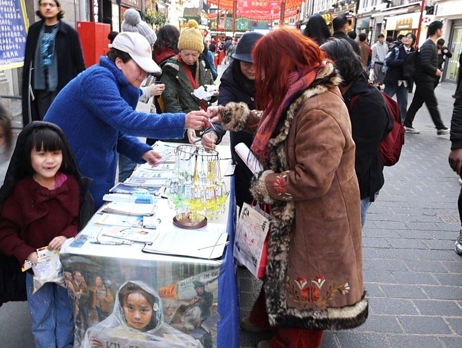 Dana 22. veljače 2026., kineska zajednica je u središtu Londona održala razne aktivnosti povodom proslave kineske Nove godine. Falun Dafa praktikanti su postavili stol i transparente kako bi javnosti predstavili praksu i podigli svijest o progonu koji traje u Kini. Nakon što su saznali za brutalni progon, mnogi ljudi su osudili kršenje ljudskih prava od strane Komunističke partije Kine (KPK).