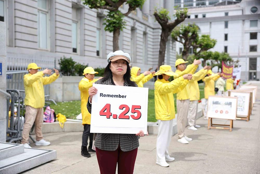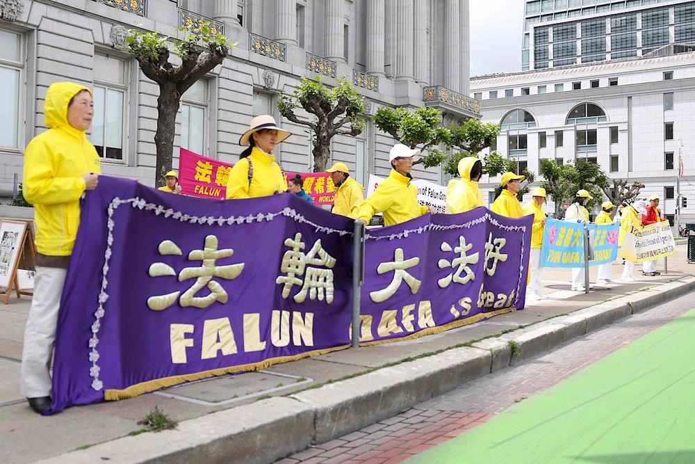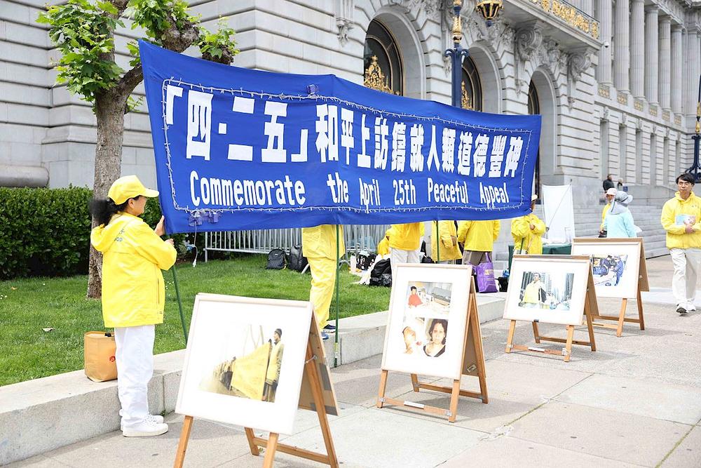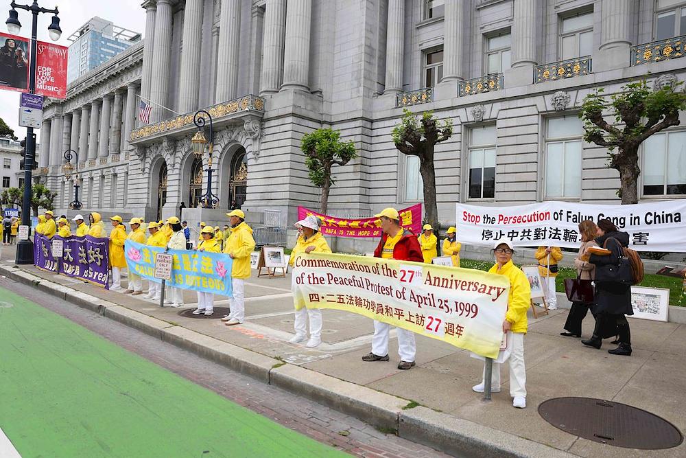 Falun Gong praktikanti su 21. aprila 2026. godine, ispred Gradske vijećnice San Francisca, održali izložbu fotografija kako bi obilježili svoj mirni apel u Pekingu održan 25. aprila 1999. godine.