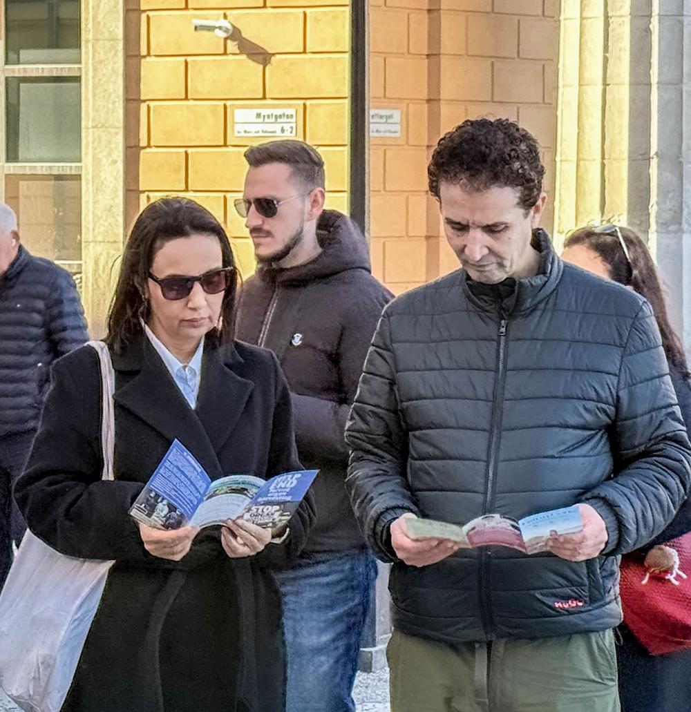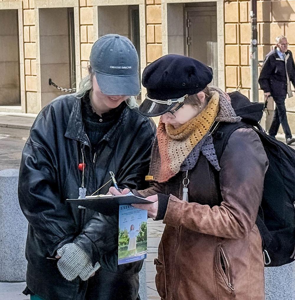 Dok je žena šetala travnjakom preko puta kineske ambasade u Stokholmu, praktikantkinja Falun Dafe joj je uručila flajer. Žena ga je prihvatila i rekla da je čula za kršenja ljudskih prava u Kini, ali da smatra da mediji mnoge stvari ne izveštavaju.