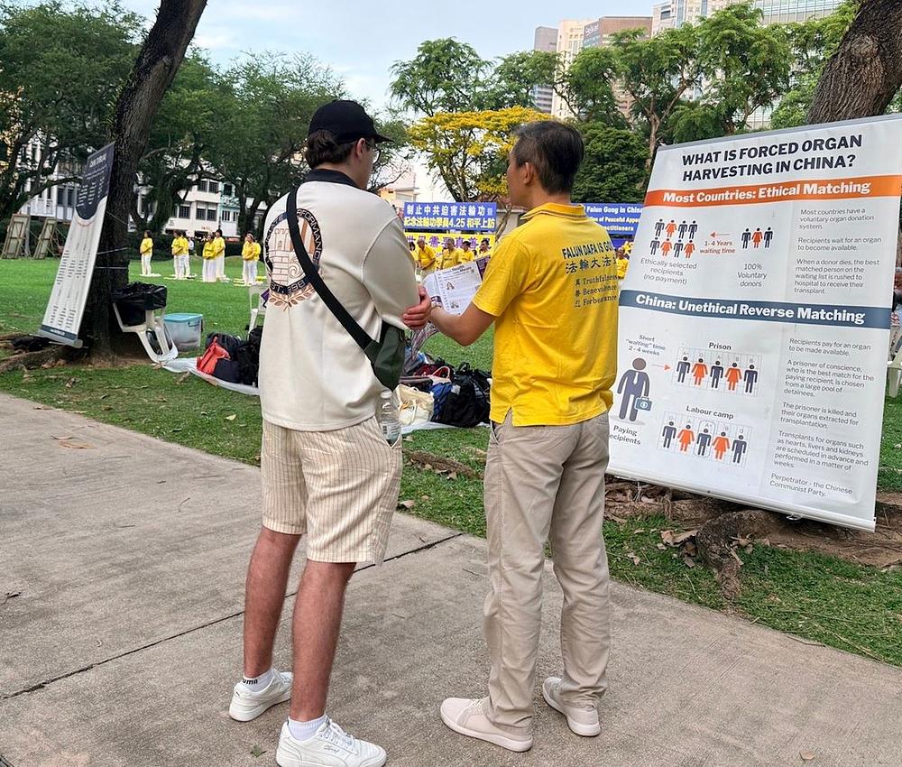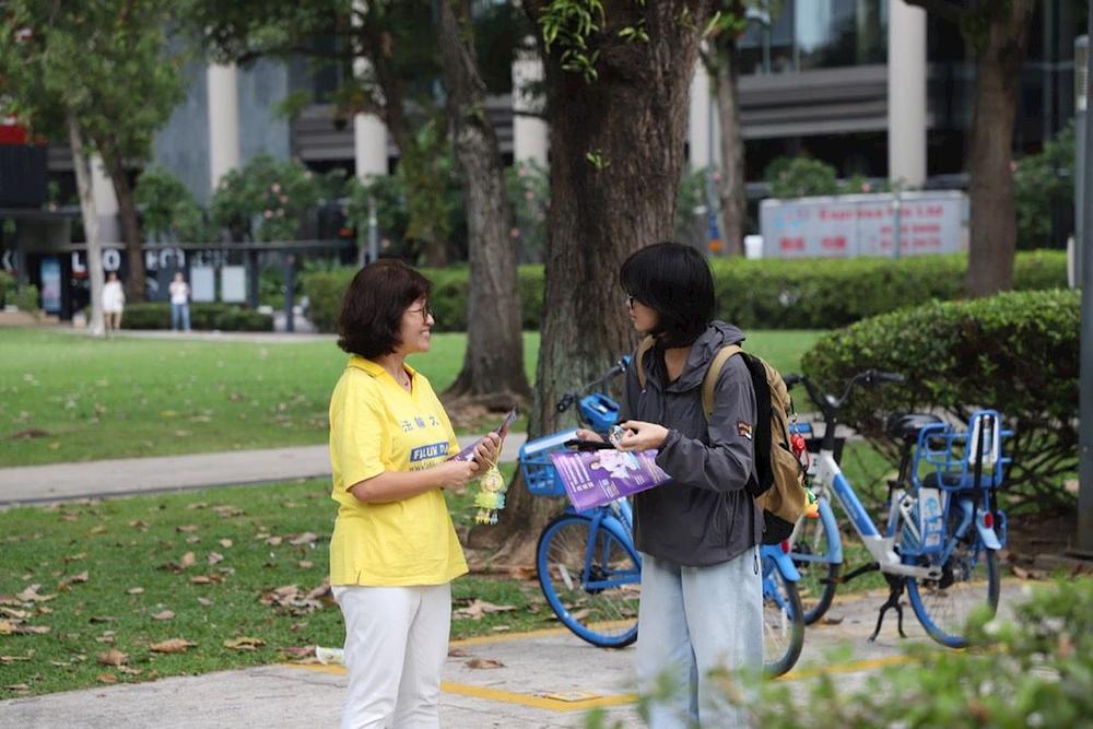 Mladić iz Kine koji je posjetio Singapur rekao je da je tamo osjetio atmosferu slobode i pažljivo je slušao objašnjenje praktikanta. Praktikant mu je rekao da je represija KPK nad Falun Dafa praktikantima također progon svih Kineza, te da potiskivanje dobrote dovodi do moralnog propadanja i raspada zakona. Kao takvi, svi snose posljedice. Mladić je rekao praktikantu: „Razumijem sve što ste rekli.”