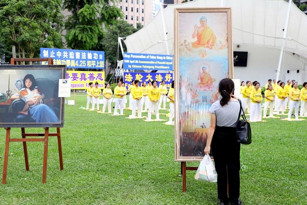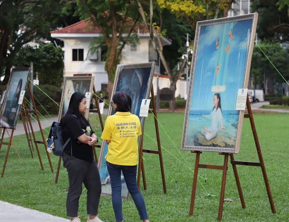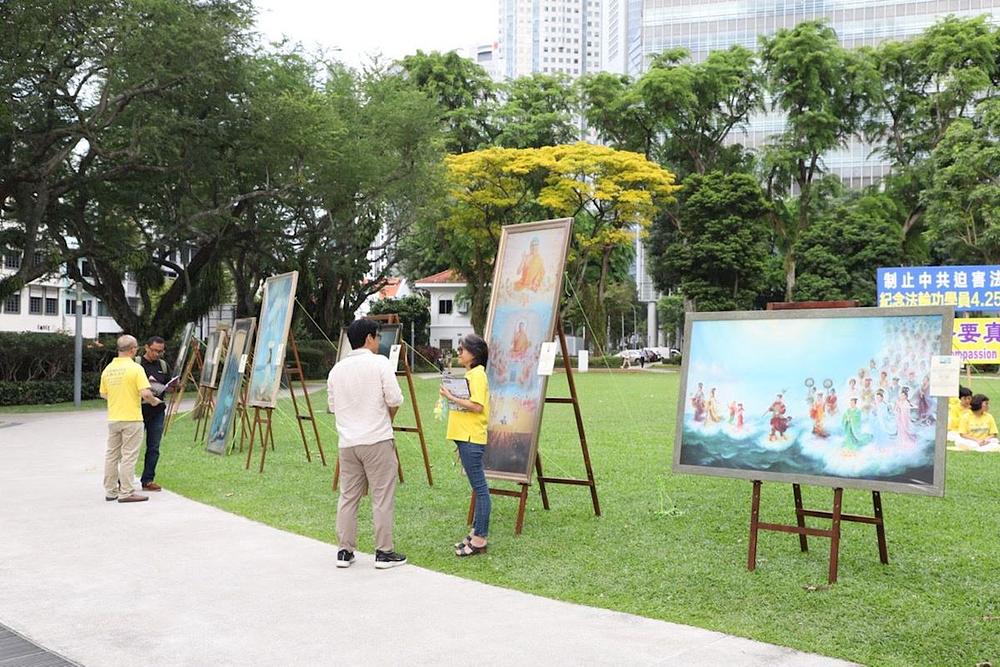 Ljudi su razgledavali slike s izložbe „Umjetnost Zhen Shan Rena”, koja je bila izložena kao dio događaja. Razgovarali su s praktikantima, razmišljali o značenjima iza umjetničkih djela i saznali o progonu vjerovanja od strane KPK. Neki su rekli da slike emitiraju neku vrstu energije, dok su drugi rekli da su se osjećali uznemireno čuvši za progon. Jeremy, Singapurac u tridesetima, pokazao je veliko zanimanje za sliku Podučavanje Fa. Praktikantica mu je ispričala o Falun Dafa i pozvala ga da prisustvuje besplatnom devetodnevnom tečaju. Također mu je rekla da je Falun Dafa udruga u Singapuru legalno registrirana organizacija i ispričala mu o brutalnom progonu u Kini.