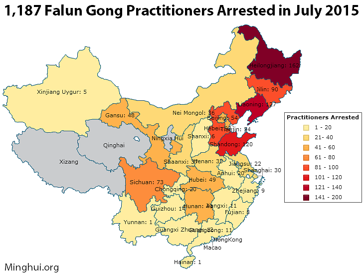 Prema informacijama koje je primio Minghui.org, kineski policija uhapsila je 1.187 praktikanata Falun Gonga samo u julu 2015. godine. Ovaj broj je blizu polovine 2.539 praktikanata uhapšenih u prvoj polovini 2015. godine.